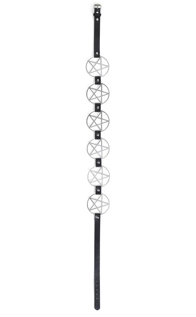 Get yer hex on with this extra Pentagram belt! Giant silver pentagram hoops are connected with luxe vegan leather. Fastening with a buckle, you can lay this baby over all yer pants, shorts n skirts that need a little extra drama.