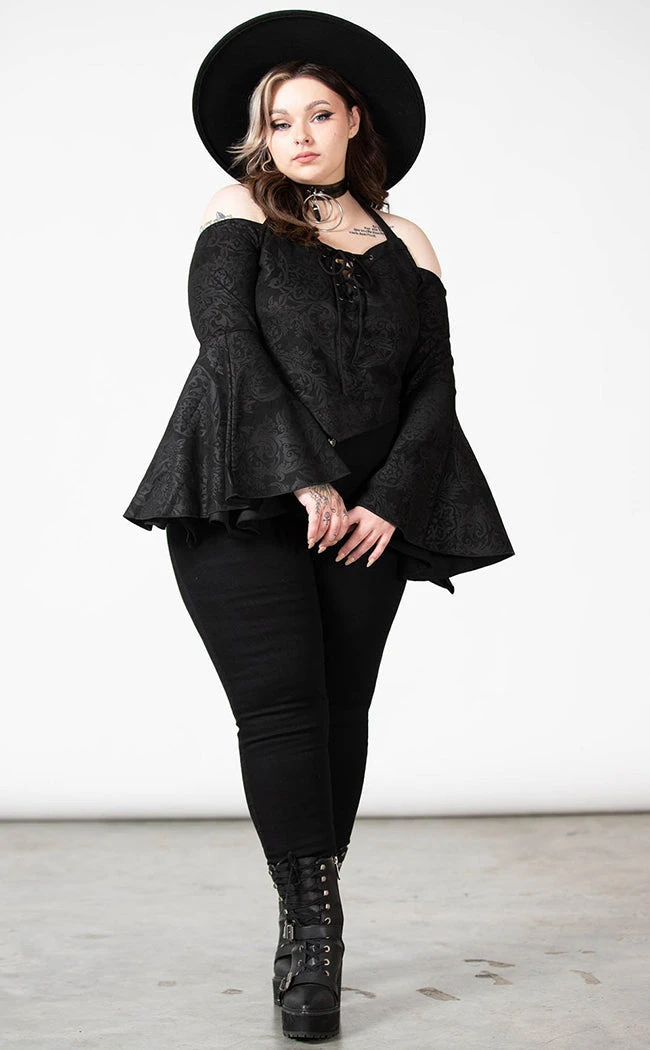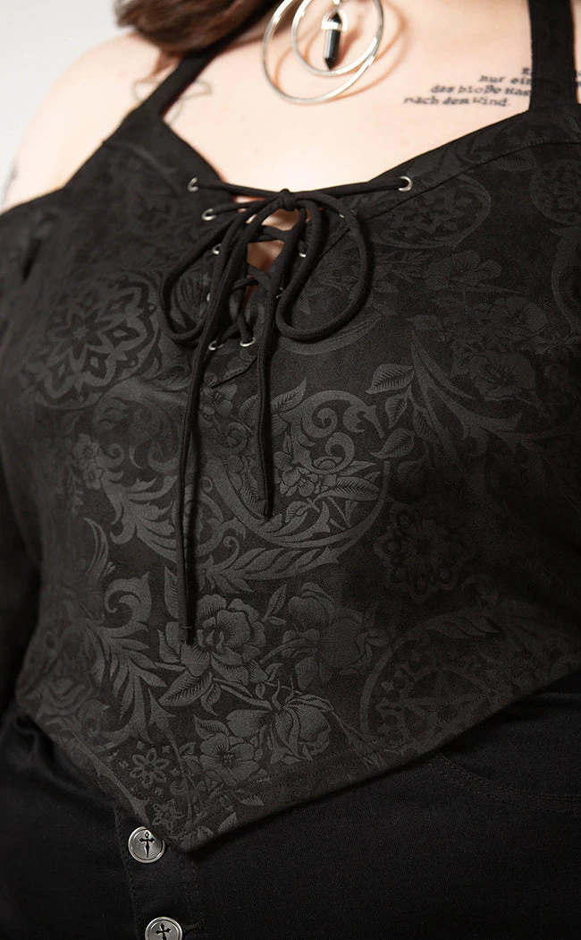 Look bewitchingly beautiful in the Periwinkle Halter Crop Top. Soft, faux suede forms this halter top, featuring dramatic bell sleeves, a lace-up neckline and a cropped V hem. The fabric is embossed with intricate patterns, great for dressing up or down for any occasion.