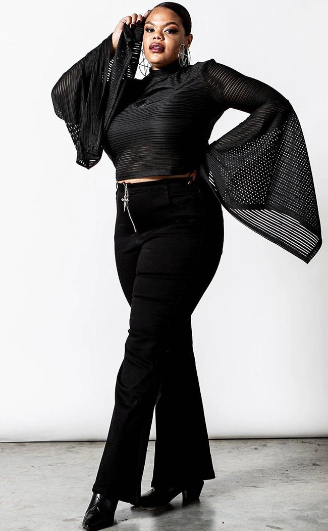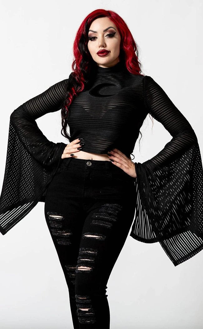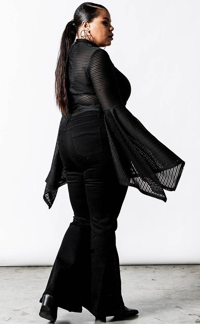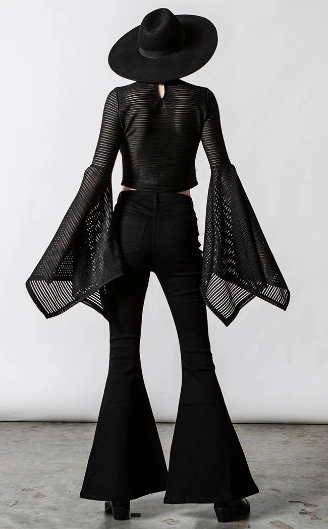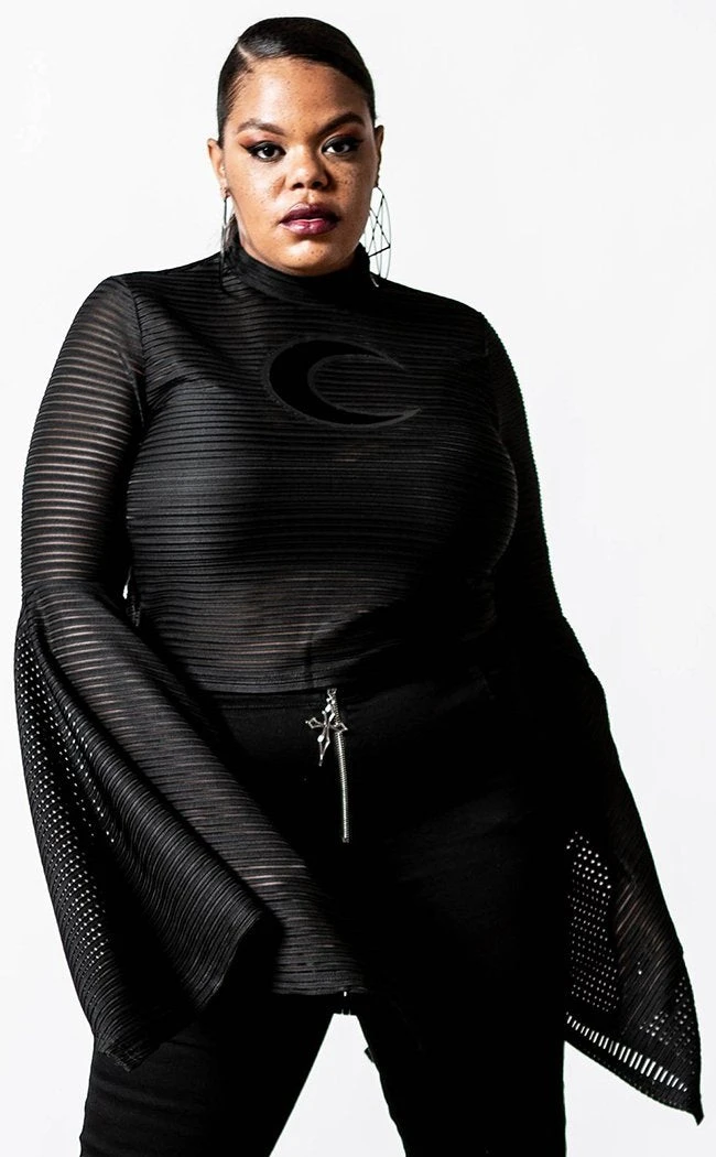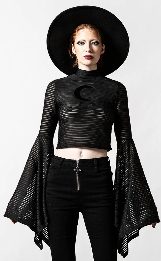 Embrace the night in the stunning Phases Striped Top!  The super-soft knit is pure shadows, forming a black-on-black stripe crop with a flattering high neckline. The dramatic waterfall sleeves and a wicked moon panel suit all-powerful moon goddesses ready for a night out.