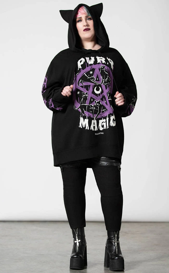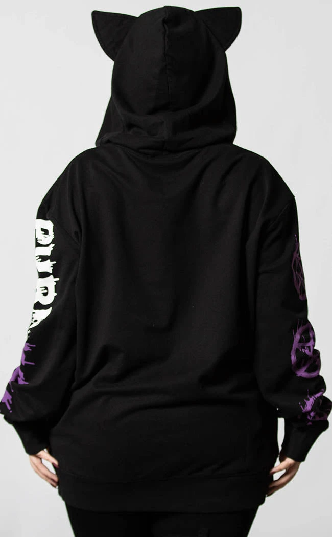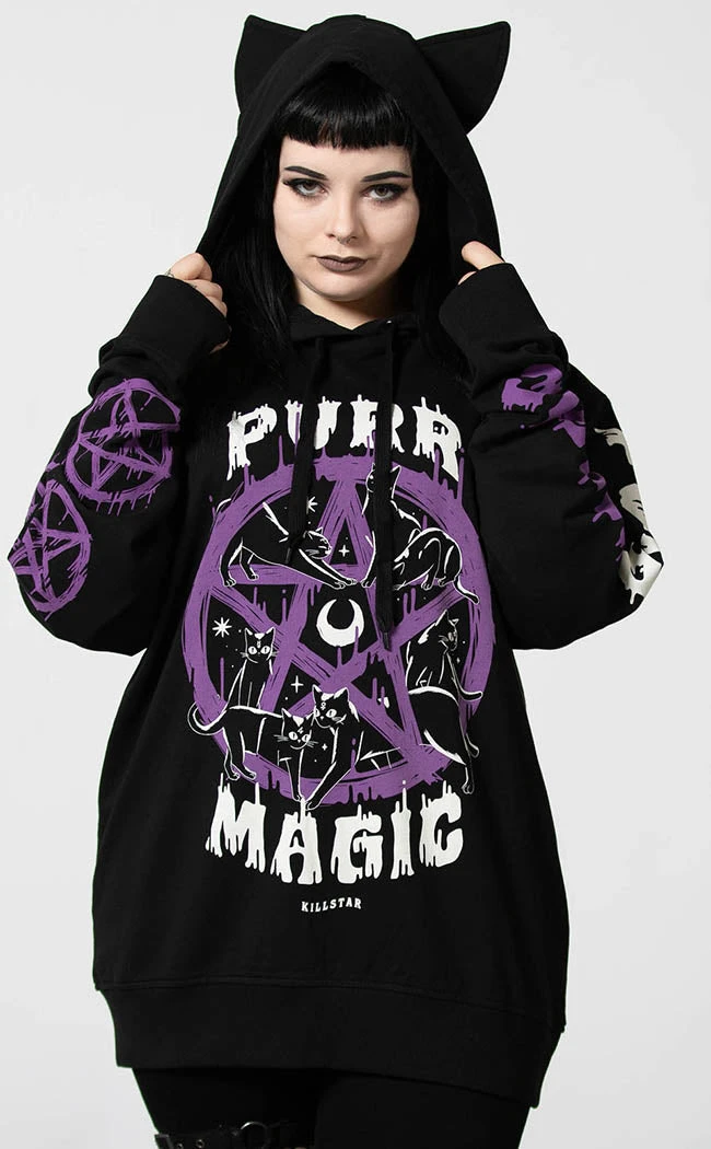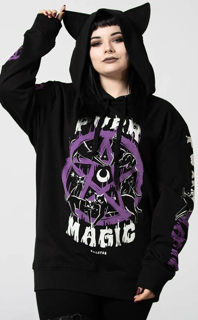 Curl up in yer crypt with the Purr Magic Kitty Hood! This adorable hoodie is made with a super soft cotton jersey and has ribbed cuffs to keep you snug. The hoodie is oversized and comes with cute kitty ears to keep ya purring. The statement print of pentagrams and black cats sits proudly on the arms and sleeves to make ya stand out in the crowd.