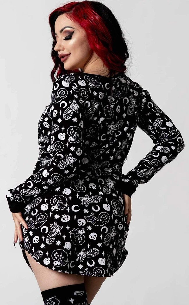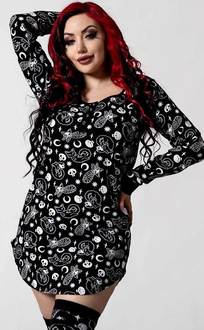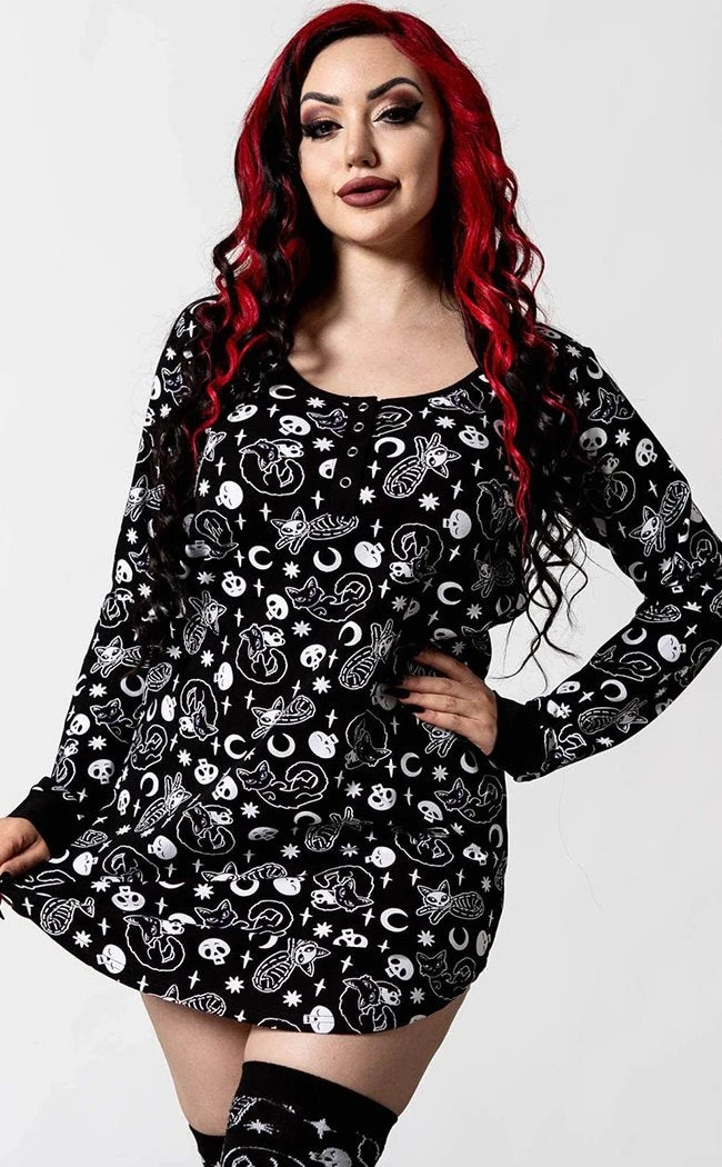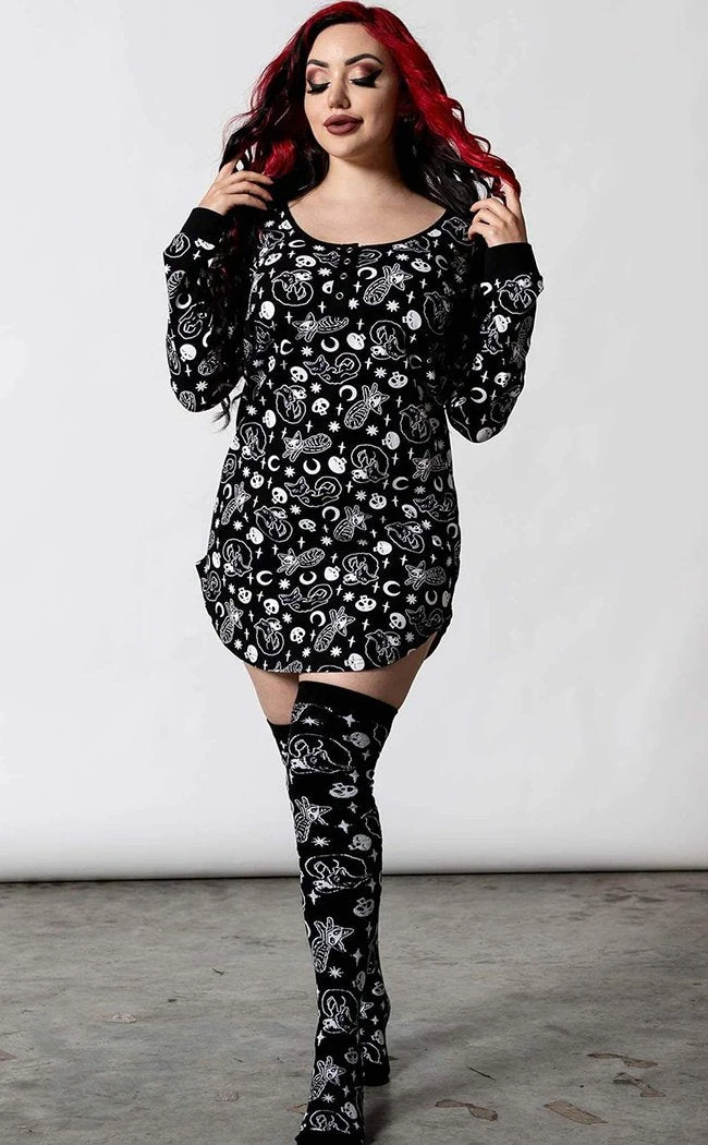 Curl up for a snooze with adorable kitties in the Purr Off sleep dress.  The fabric is soft af and covered in a contrasting pattern with occult imagery. The dress has long sleeves and a round neckline, perfect for summer as well as winter!