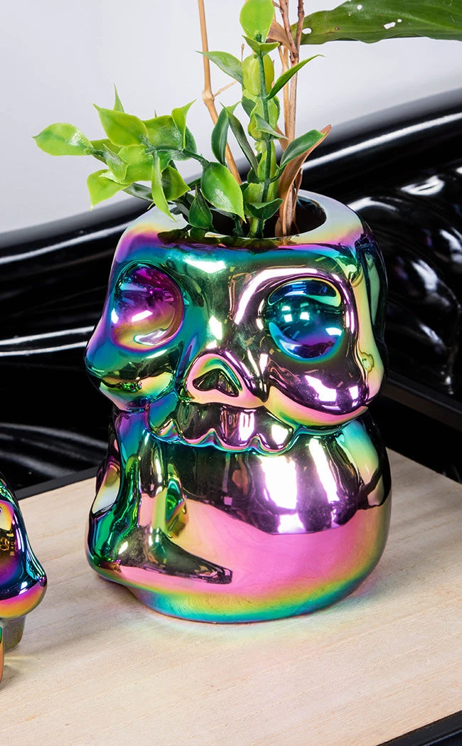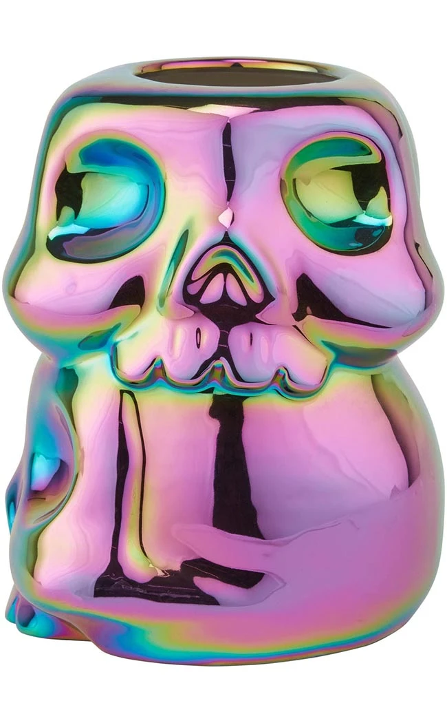 Bring home the holo rainbow with the Rainbow Skulls Vased! Shaped like a mini stack of two ooky kooky skulls, this vase is crafted from iridescent ceramic and ridiculously SHINY!