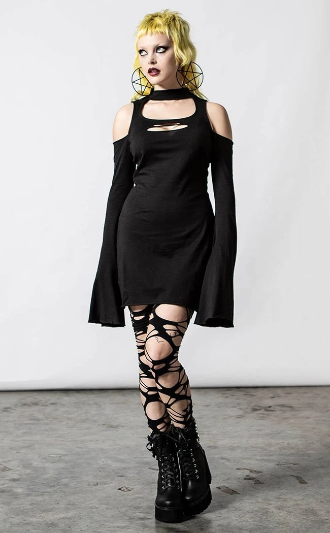 Party at the end of the world with the sexy af Rapture Dress! The high neck leads to a keyhole yoke, showing a lot of skin with cutout details on the yoke and at the shoulders. The super-soft fabric flows beautifully, forming a pointed hem and dramatic flared sleeves that cover the hands.