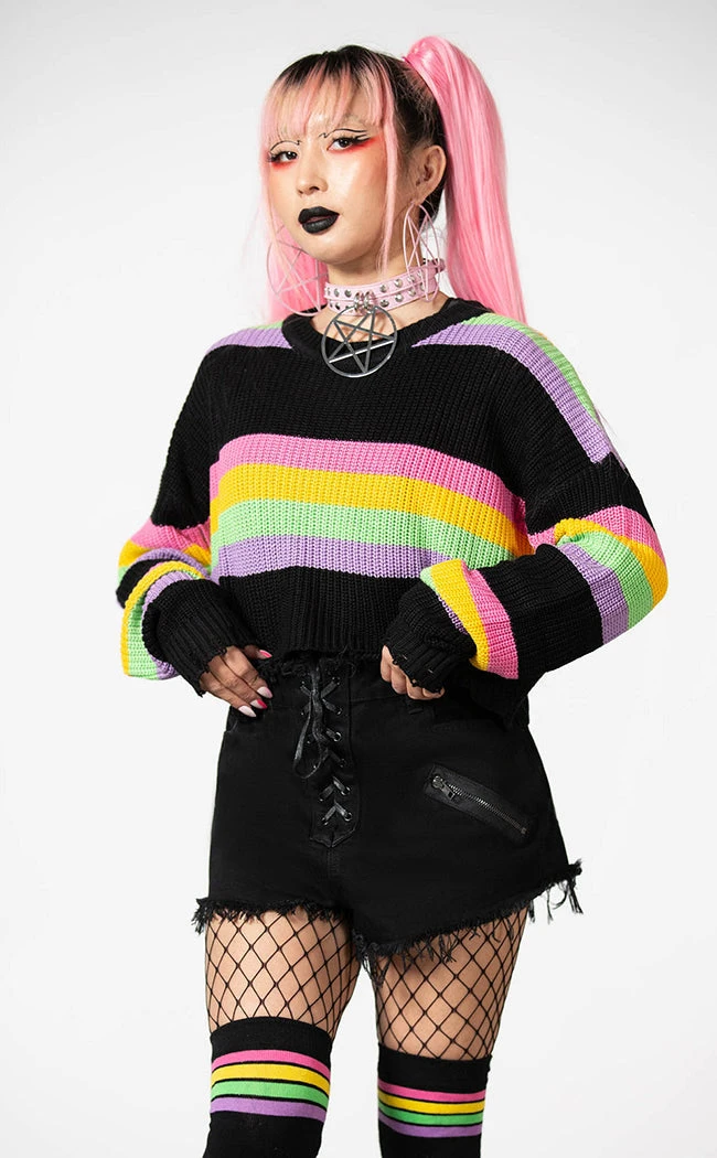 Get cute n’ colourful in the Regenboden Knit Crop Sweater! Soft, stretch knit forms this relaxed, cropped sweater, decked out in rainbow stripes, distressed details and a round neckline.