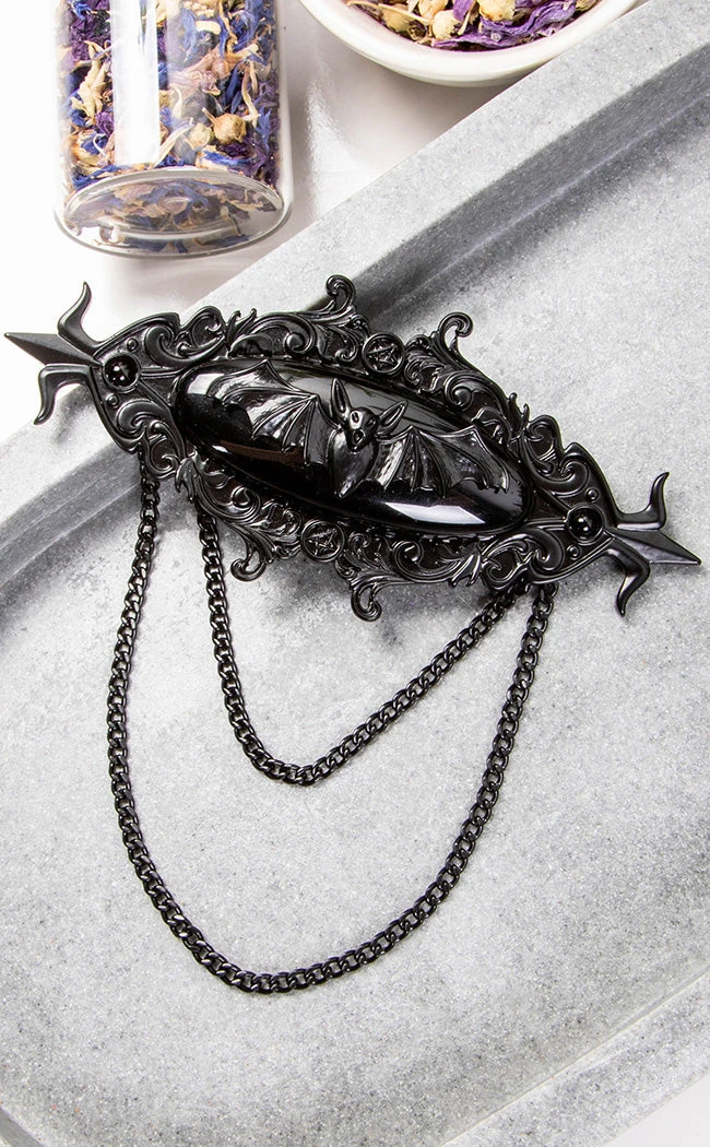 Our black hearts are going batty for the Release The Bats Brooch! This fancy piece oozes Victorian vibes with its cameo style design featuring a bat, ornate framework and two-layered chains. With a metal pin closure, slip this little night creature onto collars, pockets and anywhere that needs a touch of vampire glamour!