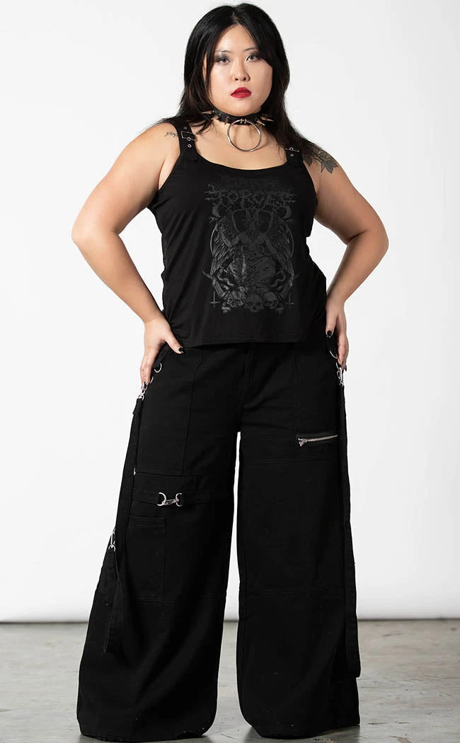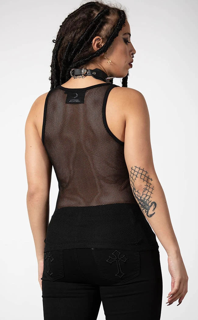 Change it up with the Remix Vest Top! The statement shoulder straps are buckled, connecting to a full mesh back. The front features a wicked black-on-black print of Baphomet so you can wear ya demons proudly.