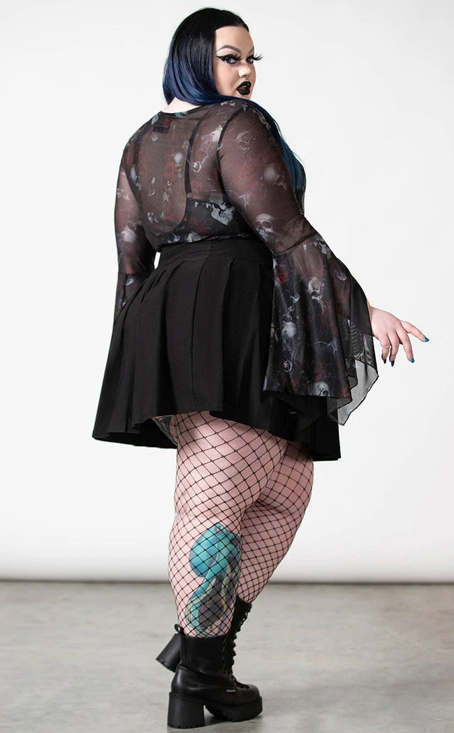 Lay yerself down in a bed of roses! The Rosaella Mesh Bodysuit will have you feeling like a vampire seductress; made from super stretch mesh printed with a wicked motif of roses, skulls and bats. The mesh forms a deep V neckline, a lace-up chest, dramatic bell sleeves and a lined gusset.