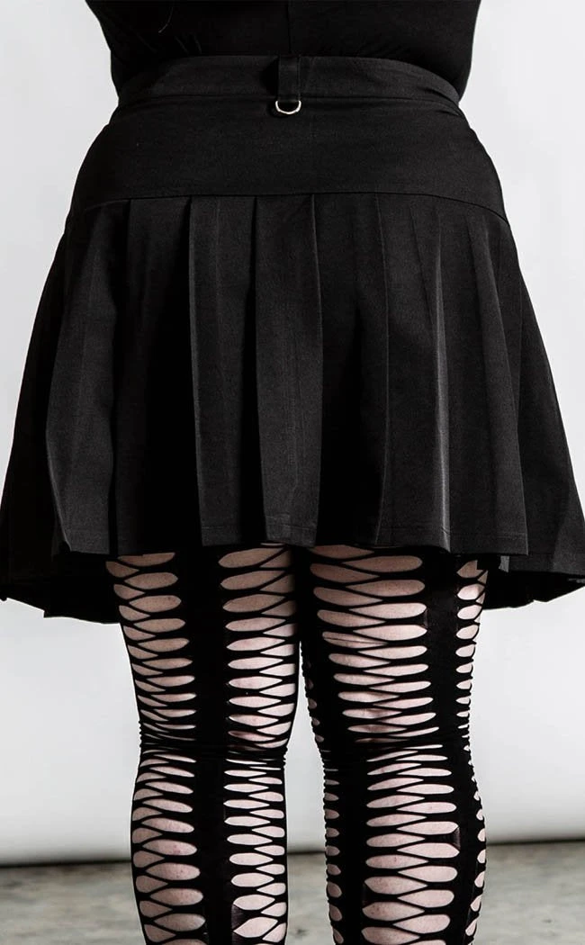 Pitch black pleats are only the beginning: the Rosalyn skirt features a chunky, full length zip to match the statement straps holding matching crosses.