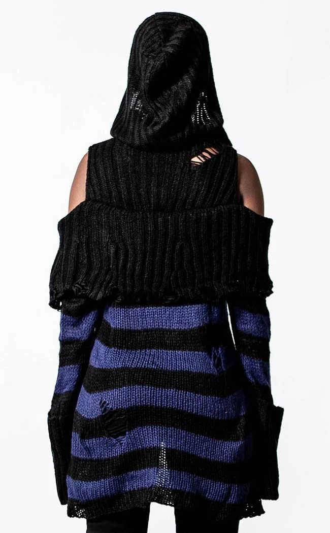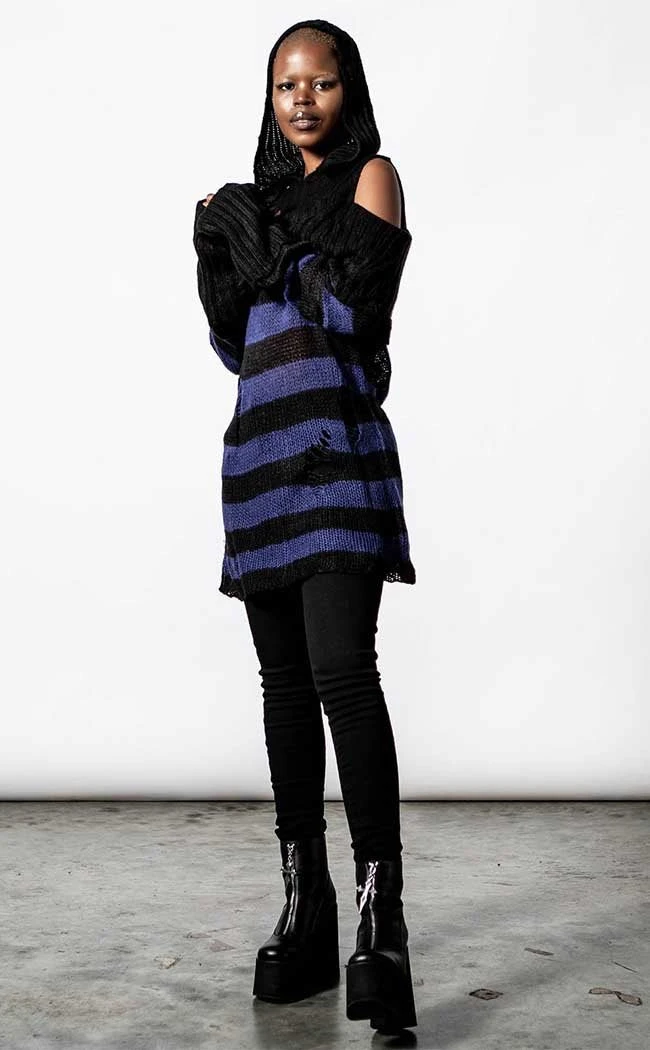 Get snug in inky stripes with the Sapphire Hooded Knit Sweater. Super soft and totally vegan, this knit wraps you in a statement bardot neckline and cosy hood. The blue and black stripes feature shredded details to get ya feeling extra badass, fitting over yer bod in effortless warmth and style.Â