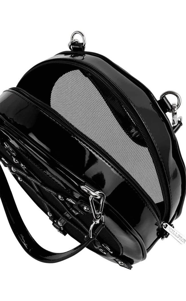 A statement bag if ever there was one! This round bag is cut into with mesh panels, inverted faux leather pentagrams creating a cage with O rings. On a night our you can use the shoulder straps or you can let it gang lower with an interchangable crossbody strap.
