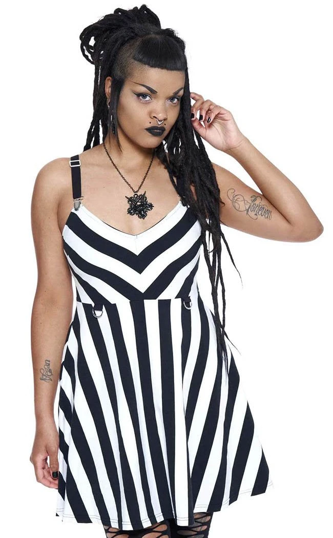 Get Hot goth Summer ready in classic stripes! The Stripe O Negative Dress is soft n stretchy, fitting yer bod nice n close for a flattering fit. The Shoulder straps are adjustable, framing a low neckline that’s perfect for showing of yer fave statement jewellery pieces.