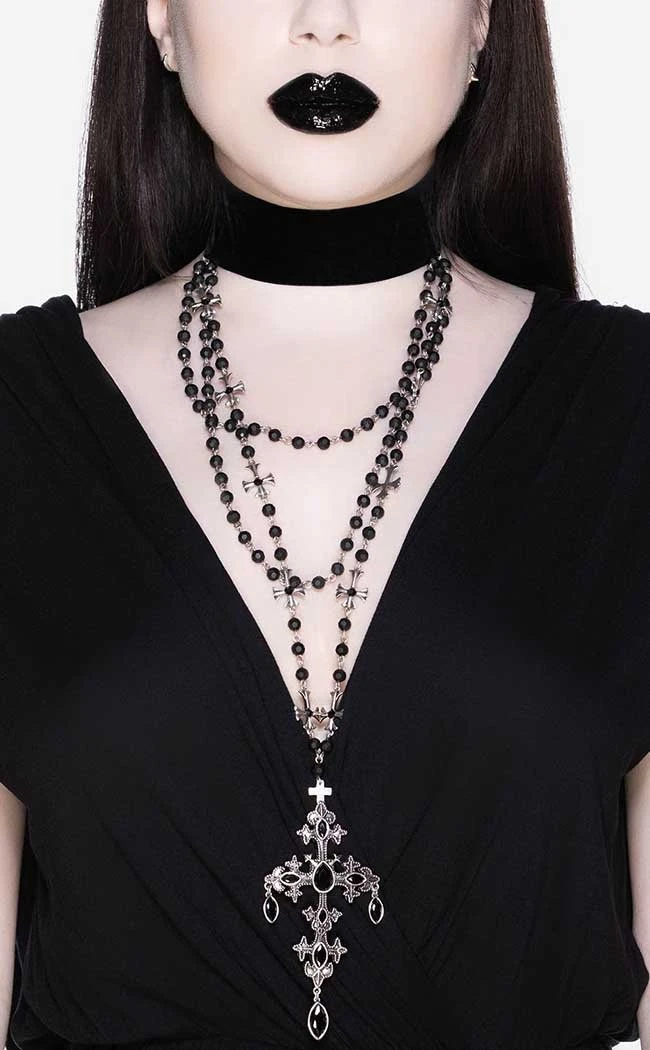 Bring out yer nosferatu chic with the Summon The Night Choker! A soft, adjustable choker ban holds layers of rosary beads, cascading down your chest to show off the elegant cross pendant.