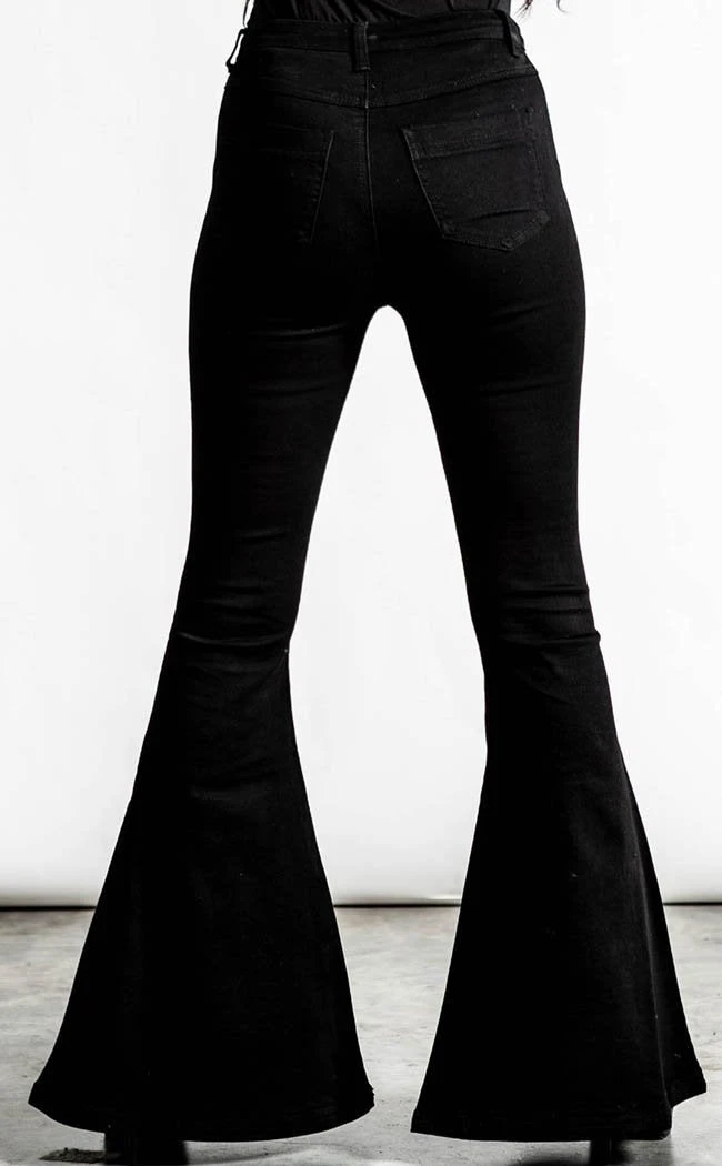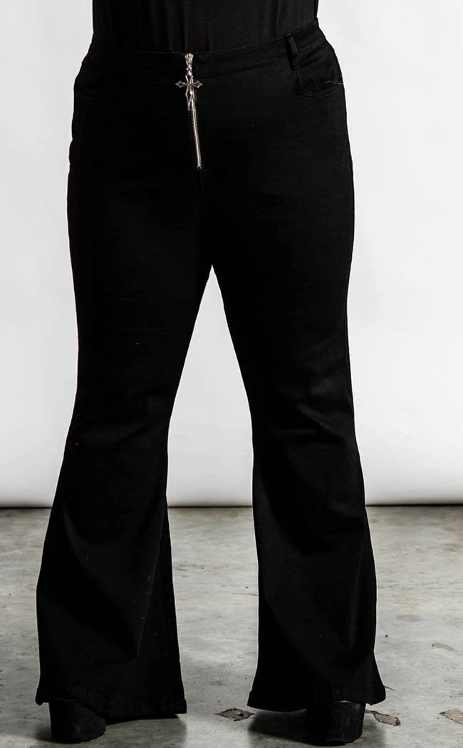 These gorgeous trousers are super long, ideal for wearing with heels, platforms or for those of you with legs up to *here*. The high waist features belt loops and a statement cross zip while the legs flare into generous bell bottoms.