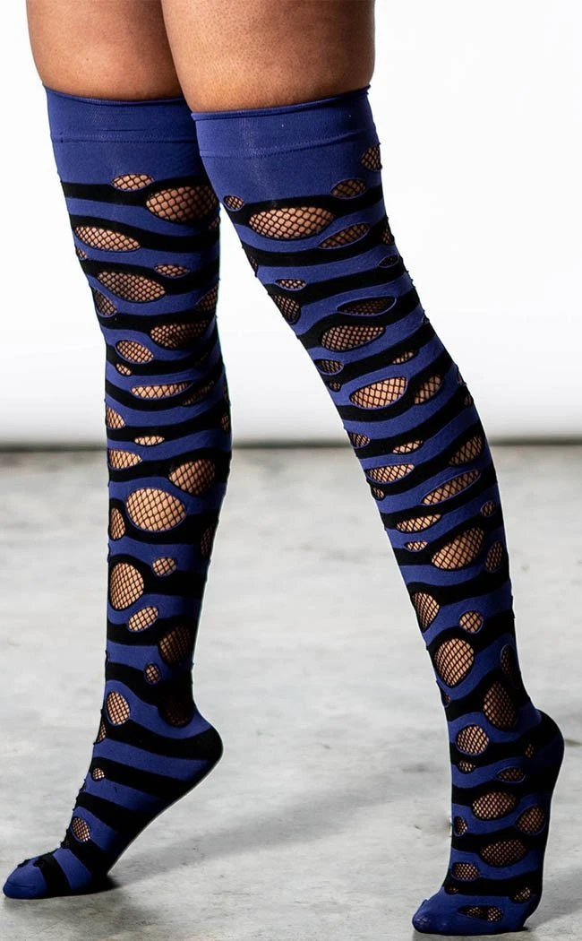 How’s this for a super-easy way to add an edge of shred to yer outfit? These thigh highs feature a striped, distressed outer layer with fishnets underneath. Â