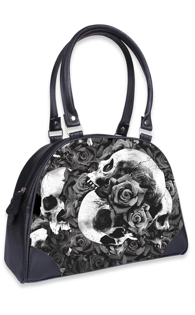 Our inevitable doom as mortals is beautiful in its own, dark way. Skulls sit in formation in a bed of roses in monochrome, an easy pairing for any of your retro and everyday looks.