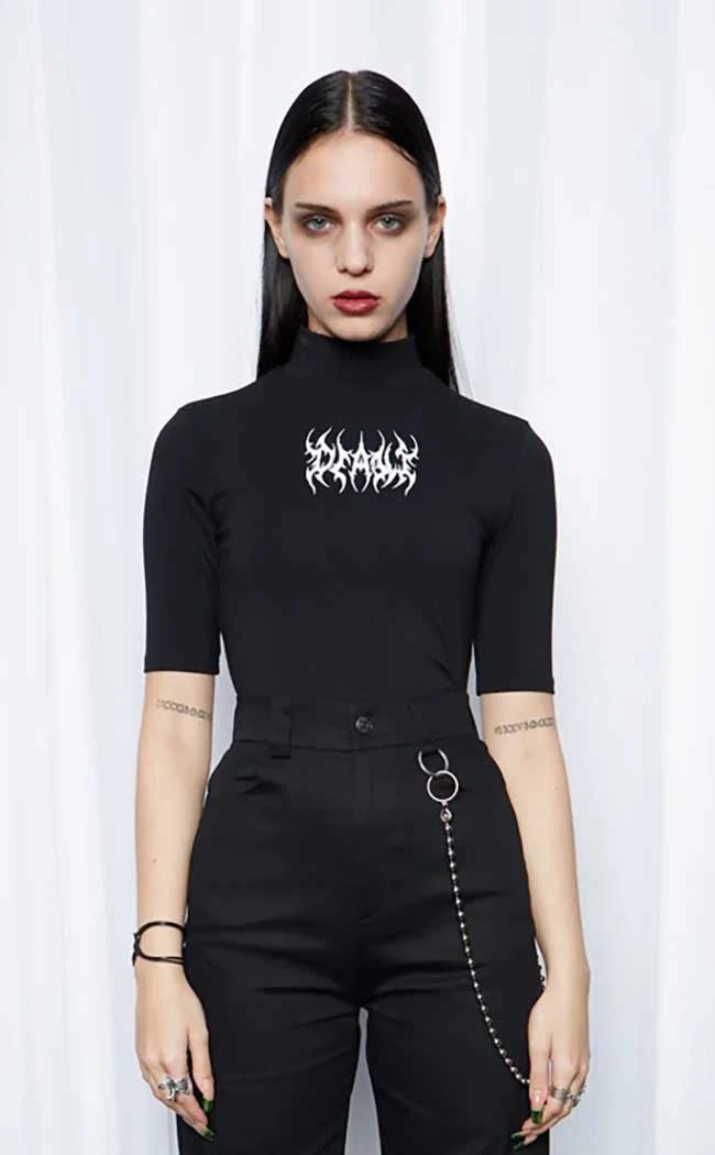 Look sleek and dangerous in the Deadly High Neck Crop. Soft cotton jersey forms this slim-fitting crop, featuring elbow-length sleeves and a high neckline. The word “Deadly” is printed on the chest in a contrasting white metal font for a simple yet impactful statement piece.