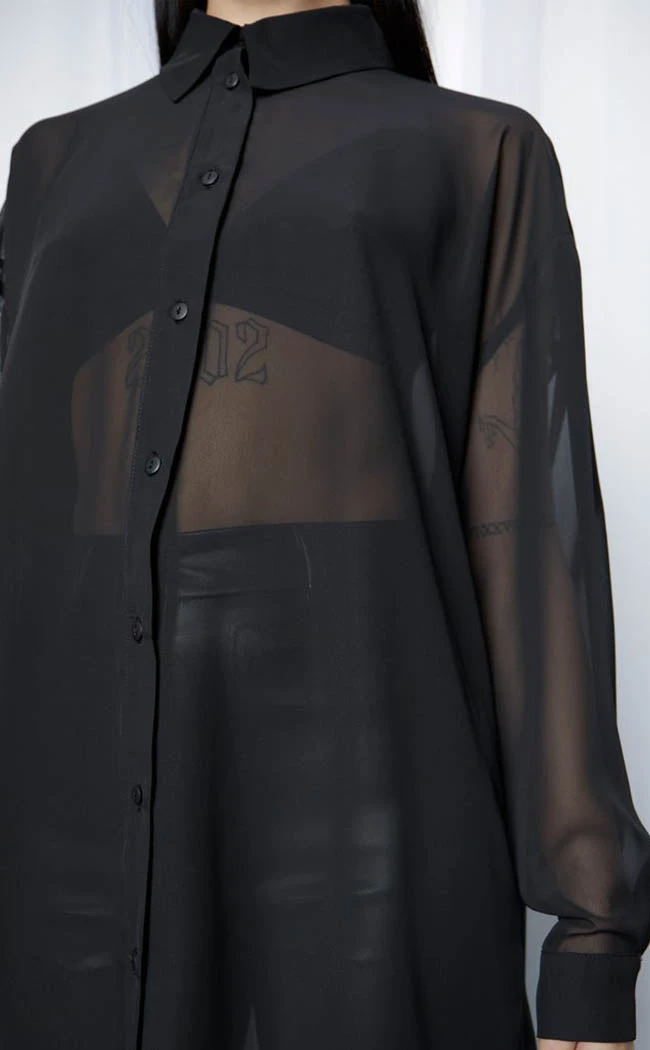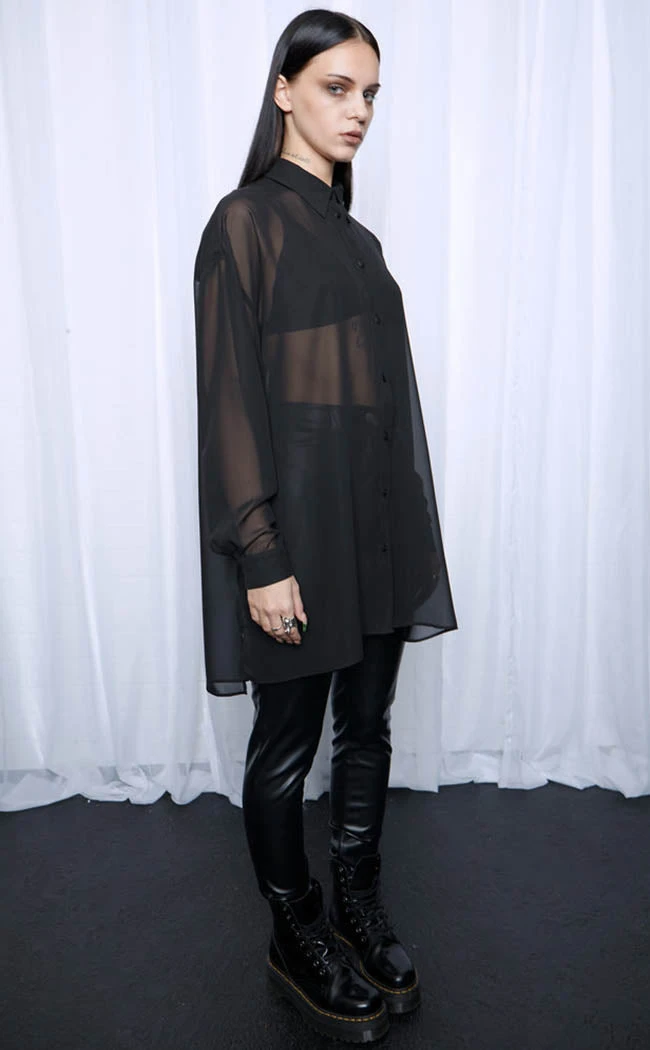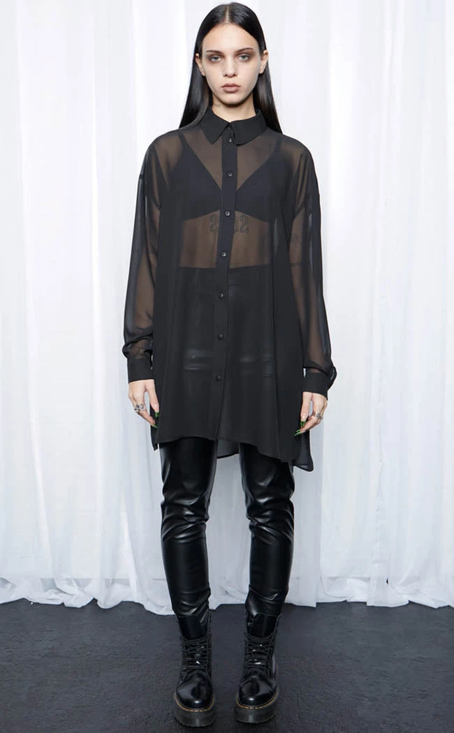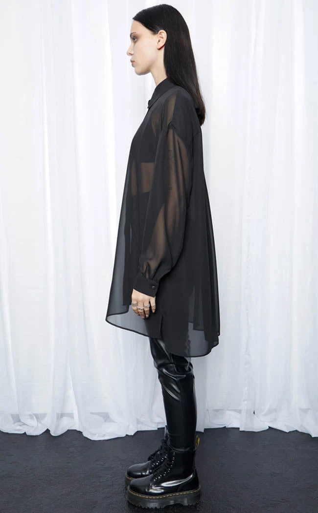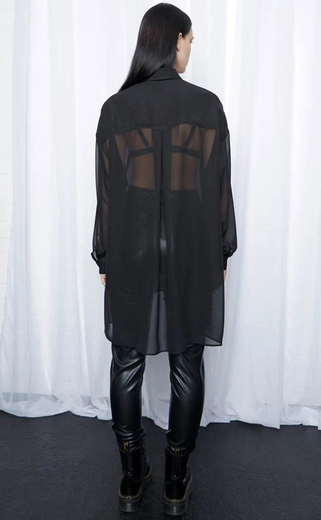 Cast shadows wherever you walk in the Drusilla Oversized Shirt! The lightweight, sheer chiffon shirt features the classic button up front and collar as well as drooped shoulders. The split hem, longline silhouette and oversized fit take the who piece to a new lever and works well worn over shirts, pants or dresses.