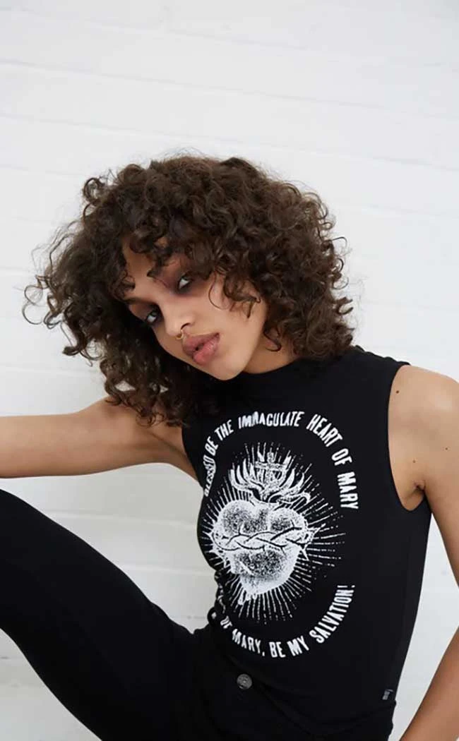 Bless your wardrobe with the Immaculate High Neck Top! Soft cotton jersey clings to yer bod in a slim fit, forming a high neckline and a waistline that sits at the natural waist. The print creates a stunning statement, with a contrasting white heart print and text that reads “Blessed be the immaculate heart of Mary, sweet heart of Mary, be my salvation!”.