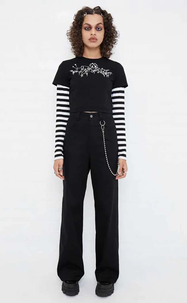 Live out yer sk8er grrl dreams in the Oblina Long Sleeve Crop Tee! Made from soft cotton jersey, the retro silhouette features a black crop tee with a crew neck and long striped sleeves. A cutesy zombie bear print on the front will have you ready to crash the mall in a snap.