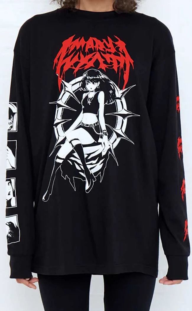 The Ren Long Sleeve Tee is the best combo of cute n evil! Warm, soft cotton forms this relaxed fit tee, decorated with a statement white and red print on the chest and sleeves.