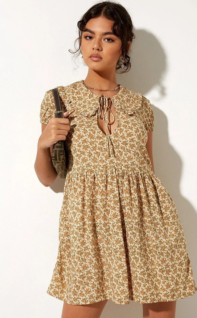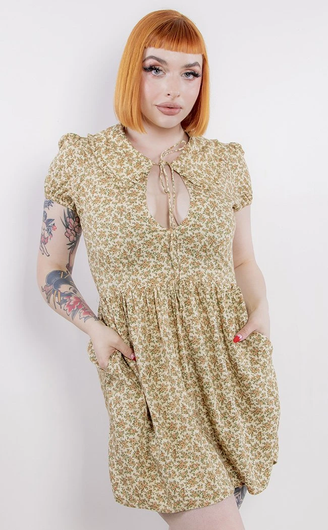 This adorable dress has an exaggerated collar trimmed in ruffles that ties to create a keyhole chest. The sleeves are short and puffy to create the a sweetheart look perfect for everyone from country brats to riot grrls.