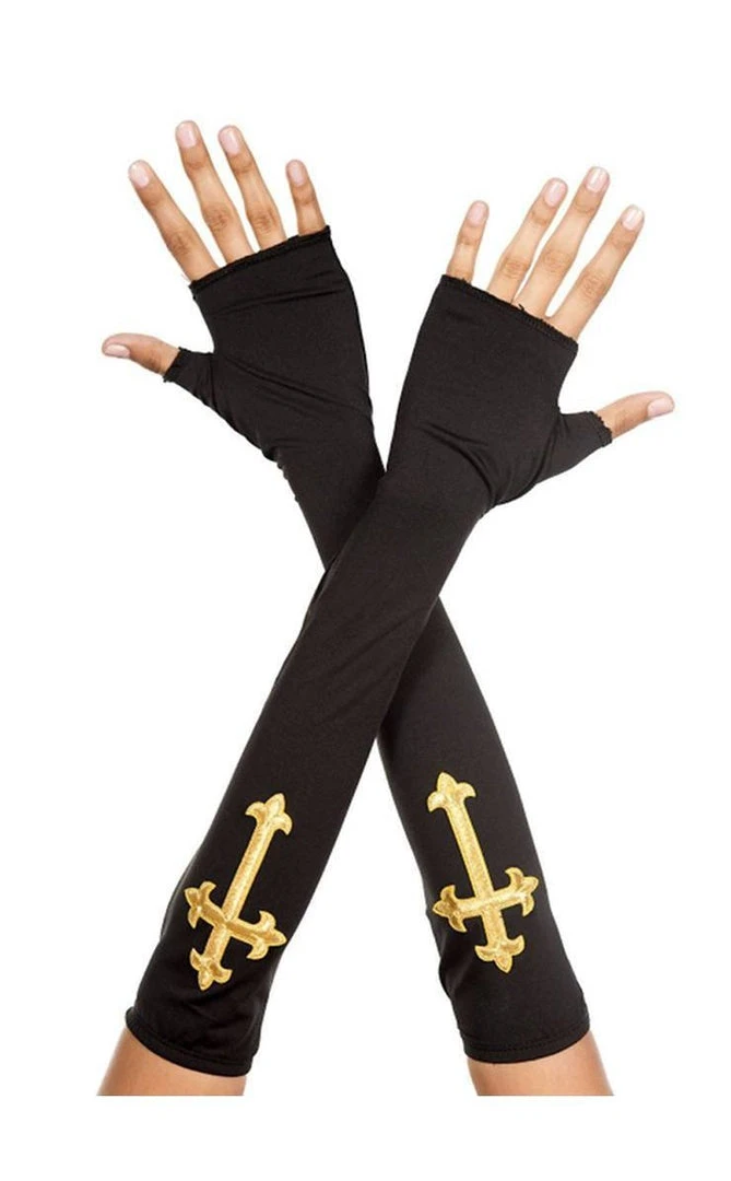 Stay warm, look cool. Gold Gothic Cross on black armwarmers.