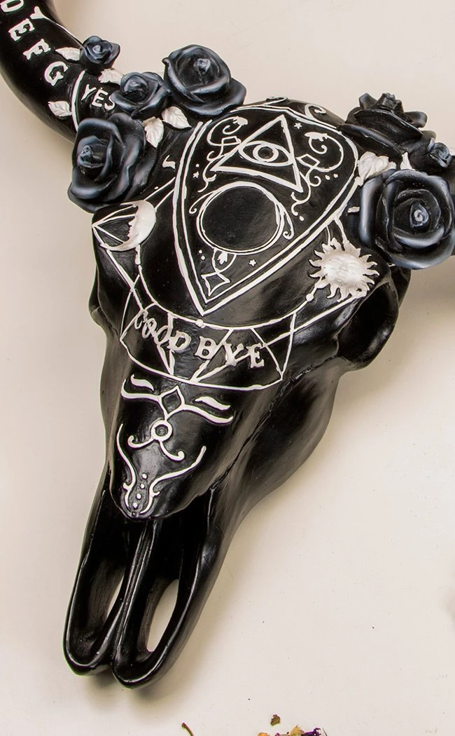 Call to the dead with a uniquely occultish skull! This beautiful girl sits bedazzled by black roses and intricate spirit board carvings. Place her at the entrance to your home to welcome everyone from guests to visiting spirits.Â