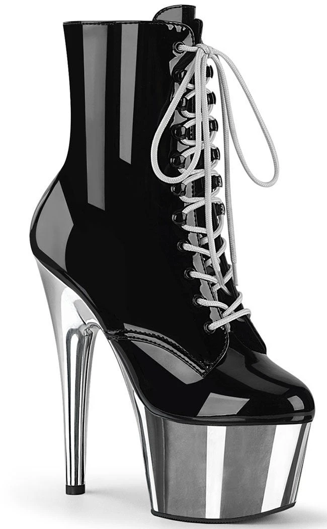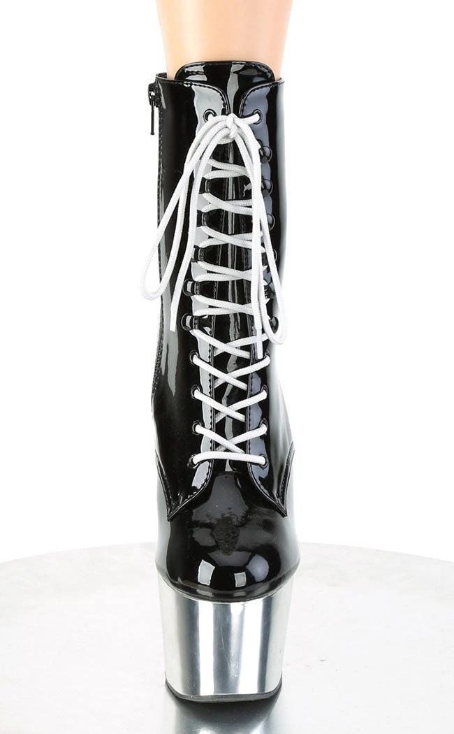 7″ (178mm) heel, 2 3/4″ (70mm) platform lace-up ankle boot featuring chrome plated platform bottom in silver and inside zip closure