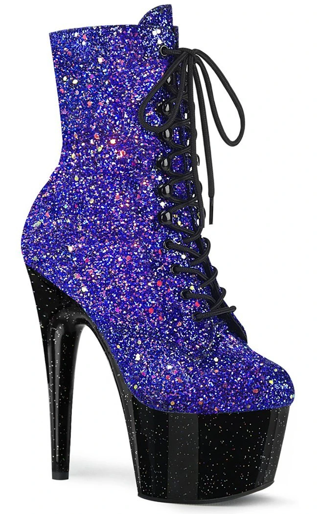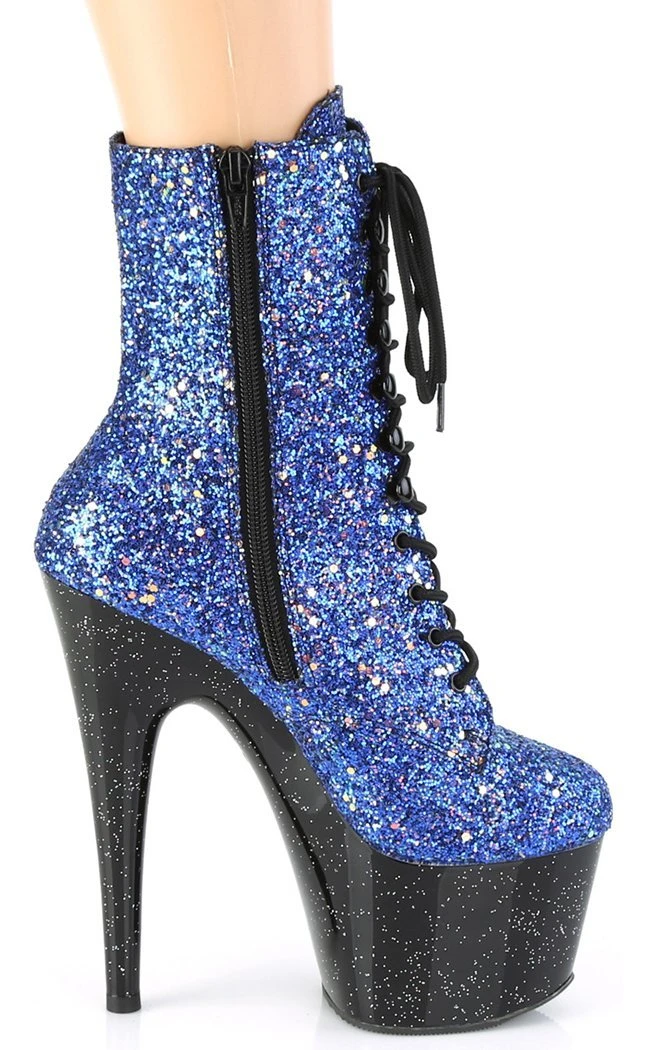 7″ (178mm) heel, 2 3/4″ (70mm) platform. Glitter upper with small iridescent glitter on entire platform. Inner zip closure.