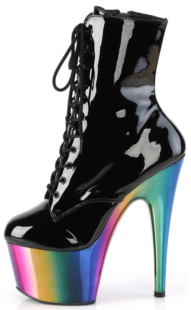 This bootie has a sleek black patent upper and a shining rainbow chrome heel and platform. With a lace up front and inner zip for easy on/off, these booties are ideal for cyber dancers and futuristic pole fitness fanatics.