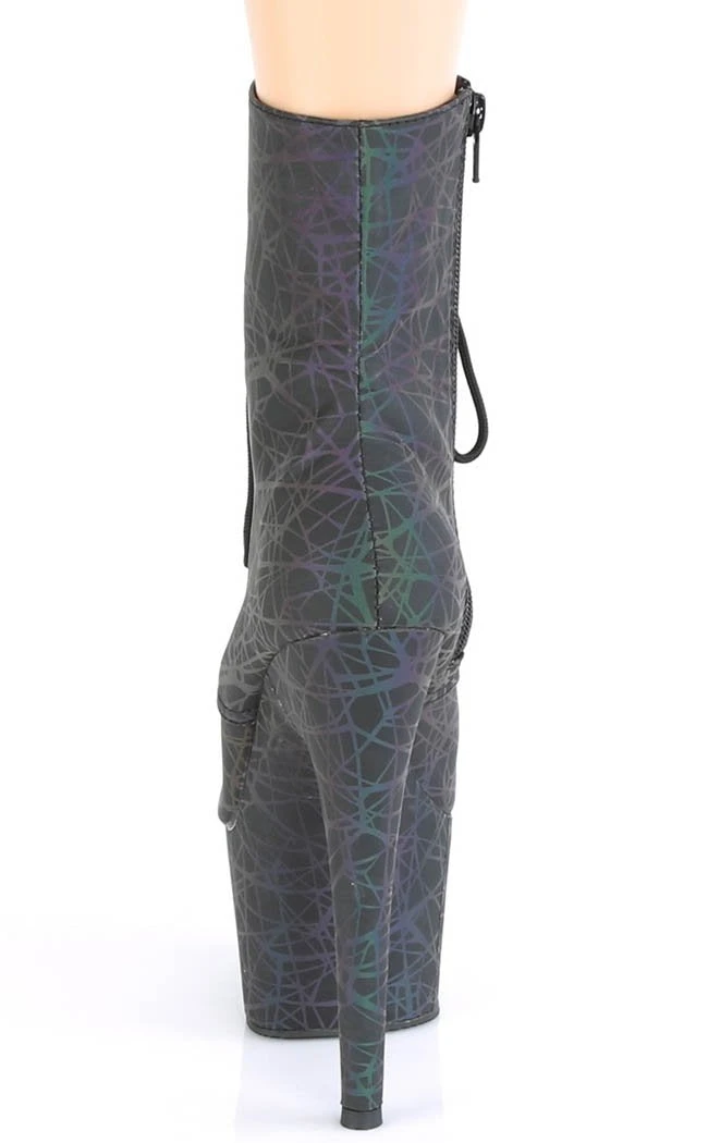 A bootie that reveals green & purple reflective webbing when placed under a black light. With a lace up front and inner zip for easy on/off, these booties are ideal for cyber dancers and futuristic pole fitness fanatics.