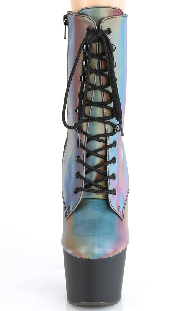Oil slick iridescent effect rainbow reflective platform booties with lace-up front. Popular for pole and exotic dancers, these babies ooze sex appeal and glamour.Â