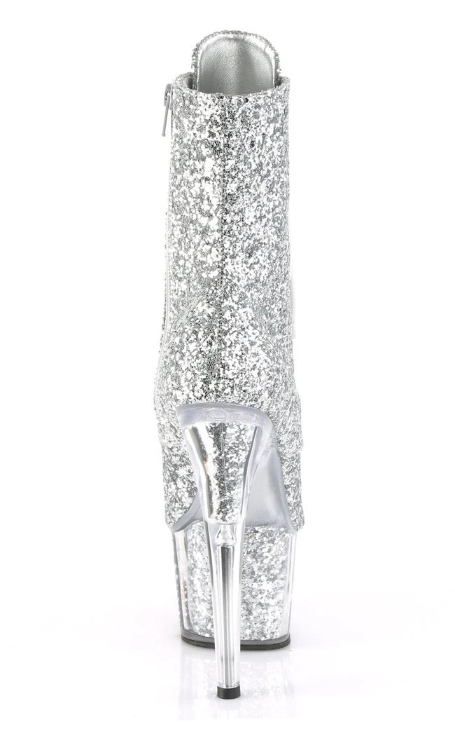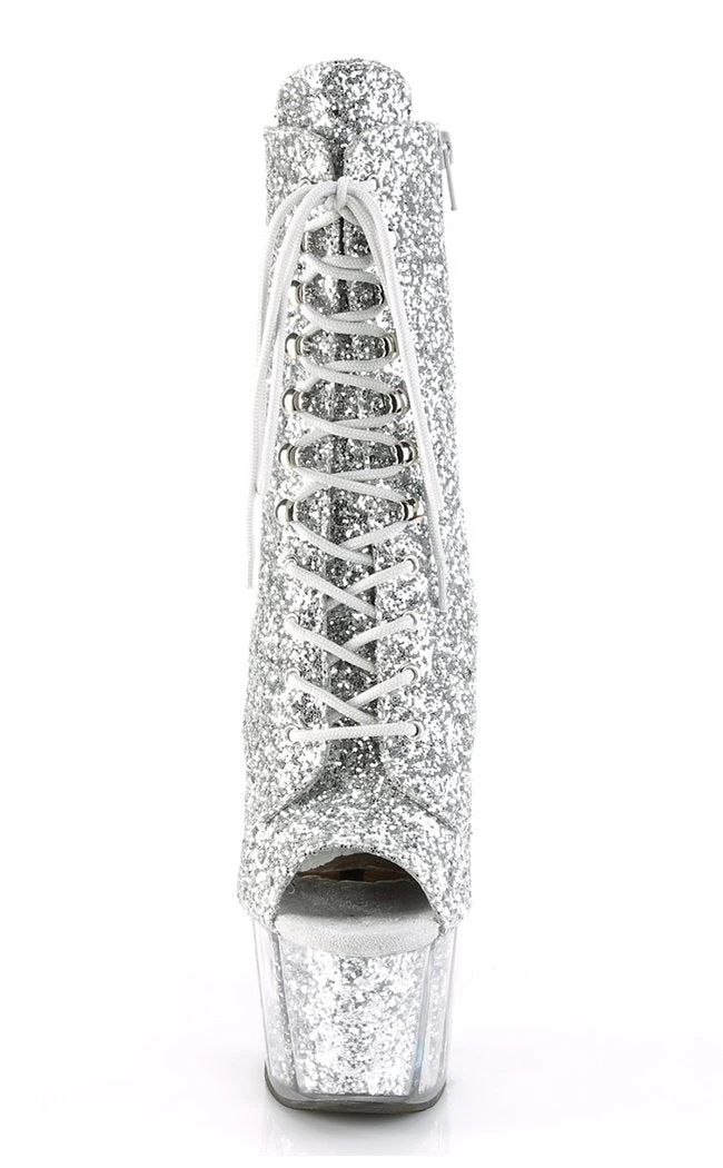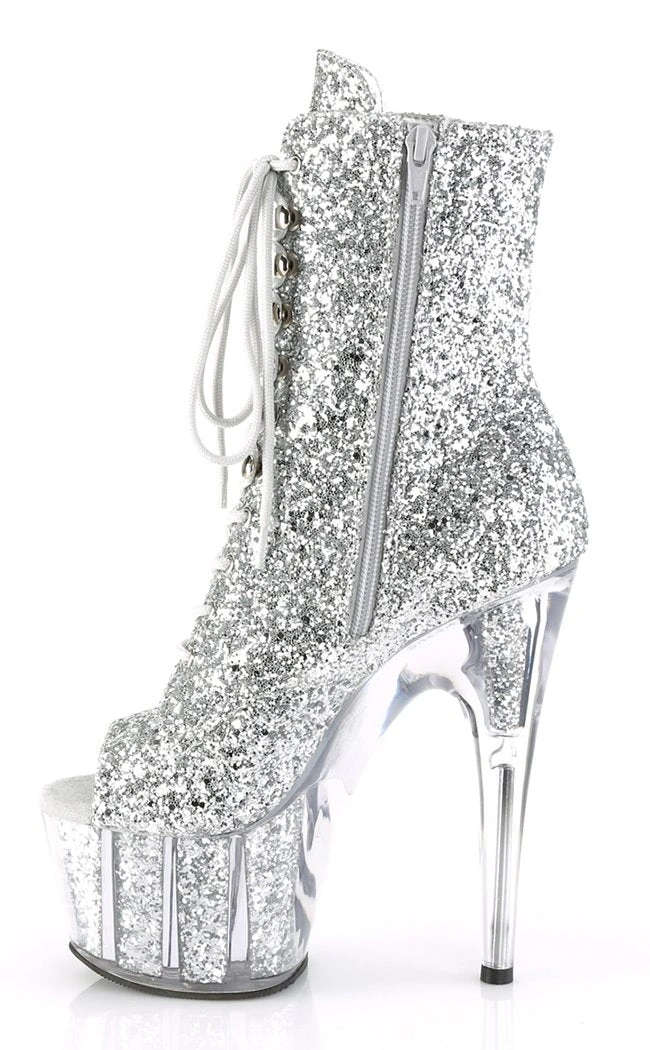 7″ (178mm) heel, 2 3/4″ (70mm) glitter filled platform lace-up front peep toe ankle boot, full inside zip closure.