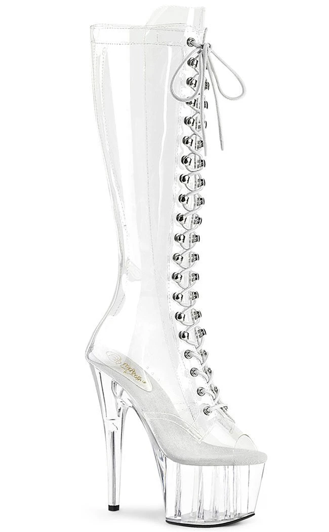 Clear knee high boots with a 7″ heel and a 2 3/4″ platform. Comes with a peep toe and fastens with a lace up.