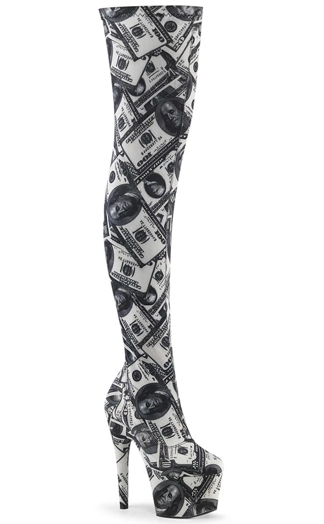 Dress up like you’re cashed up! These seductive thigh highs are covered in a US dollar print, securing with a size zip.