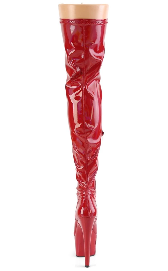 Stretchy holographic thigh high boots with an inner zip closure.Â