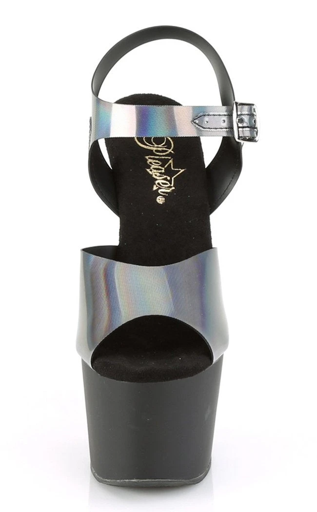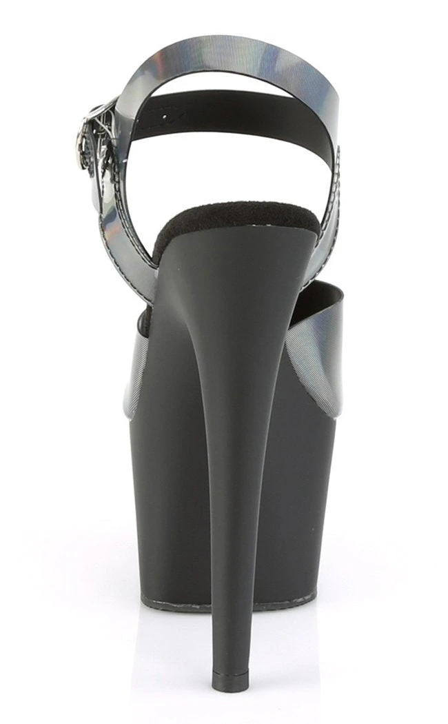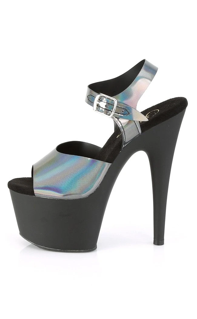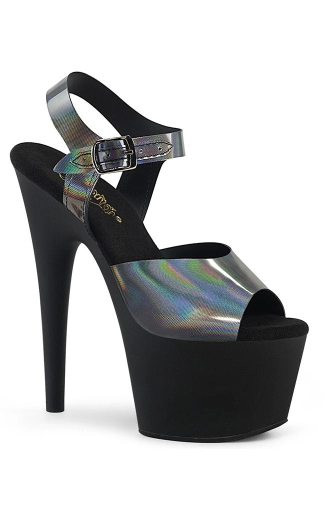 Shiny pewter holographic platform heels with contrasting matte black platform. Popular for pole and exotic dancers, these babies ooze sex appeal and glamour.Â