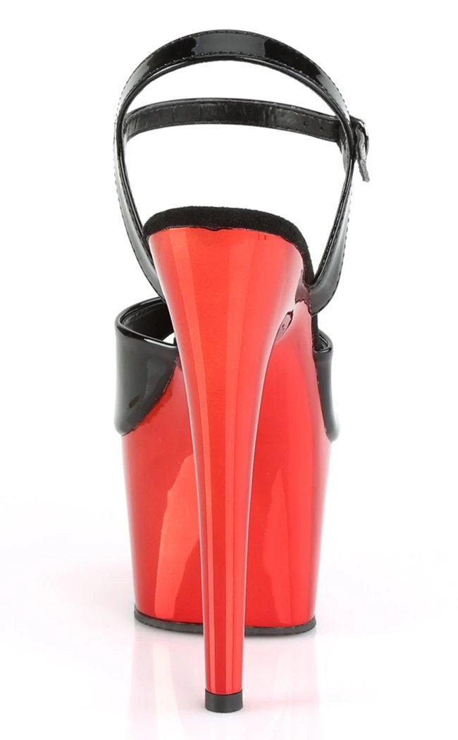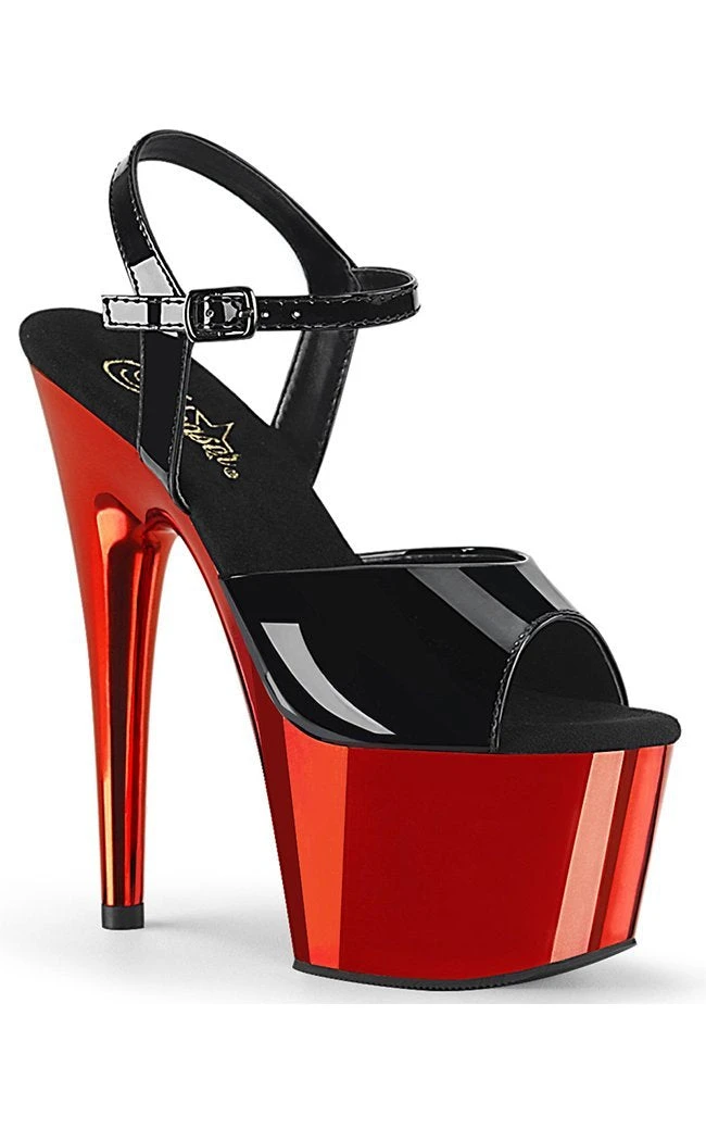 Shiny black patent faux leather platform heels with contrasting red chrome platform. Popular for pole and exotic dancers, these babies ooze sex appeal and glamour.Â