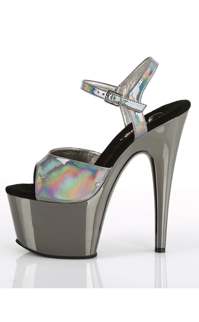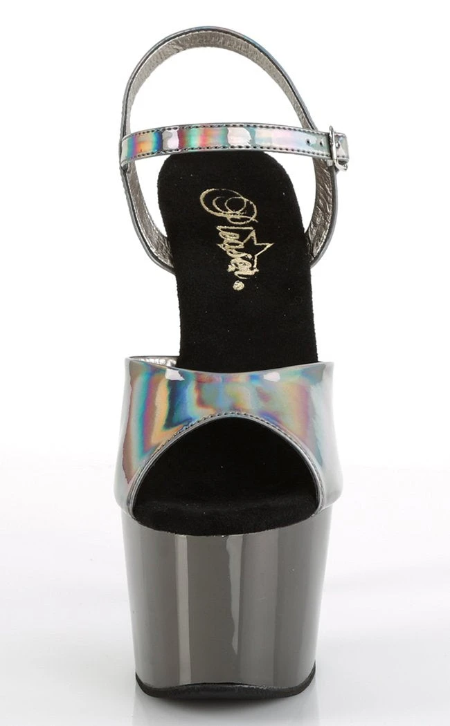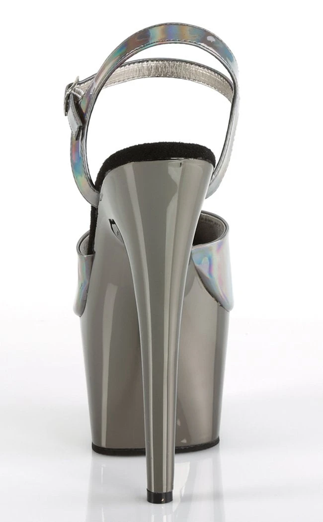 7″ (178mm) heel, 2 3/4″ (70mm) platform ankle strap sandal w/ chrome plated platform bottom
