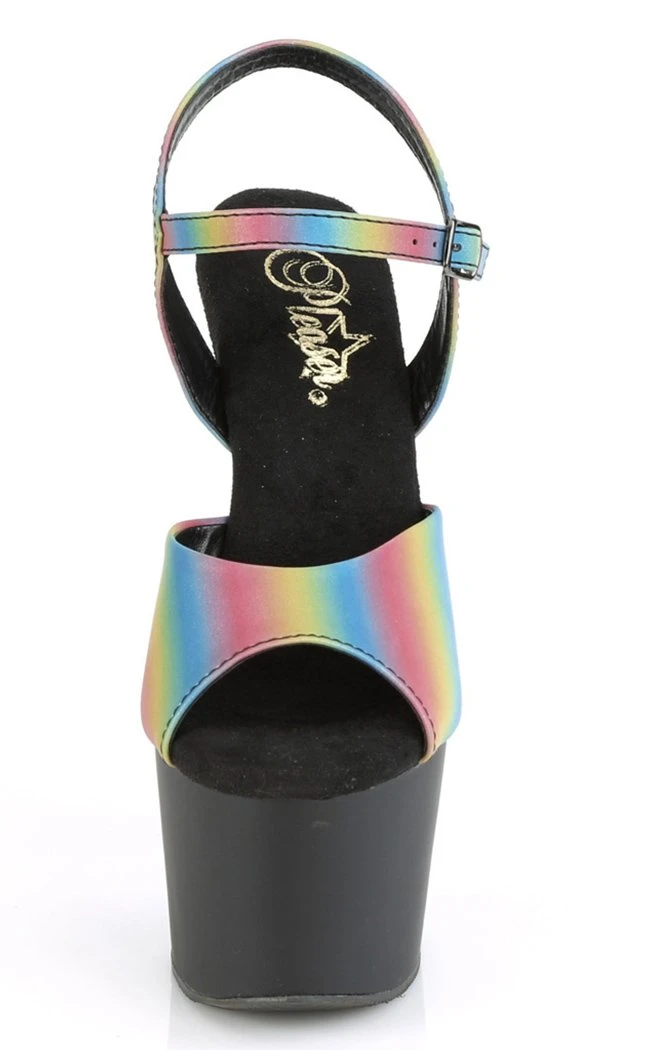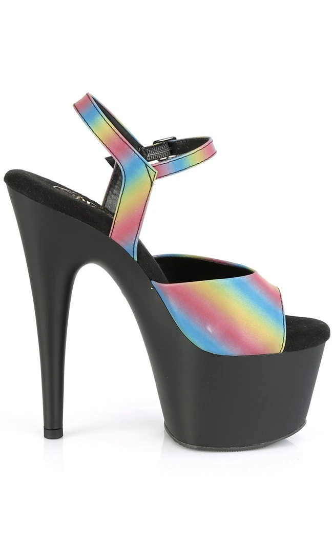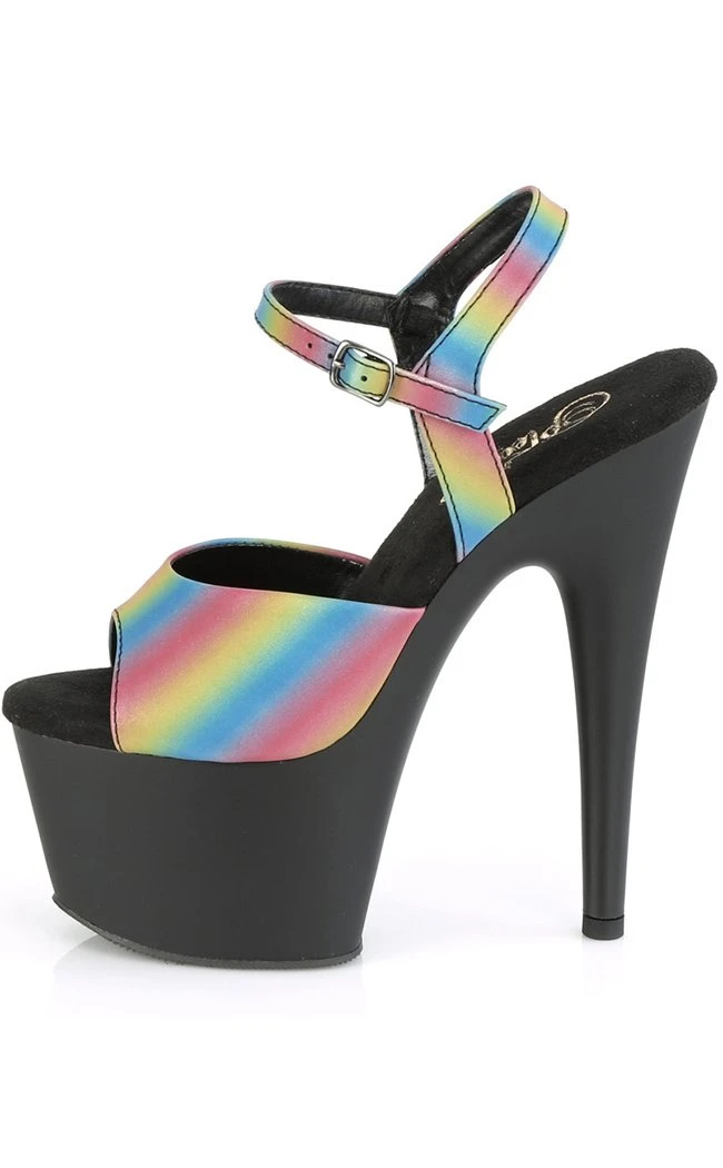 The ADORE-709REFL-02 heels have a UV reactive rainbow upper and a matte black heel and platform. Secures with a buckled ankle strap. Perfect for professional dancers and pole fitness fiends alike!