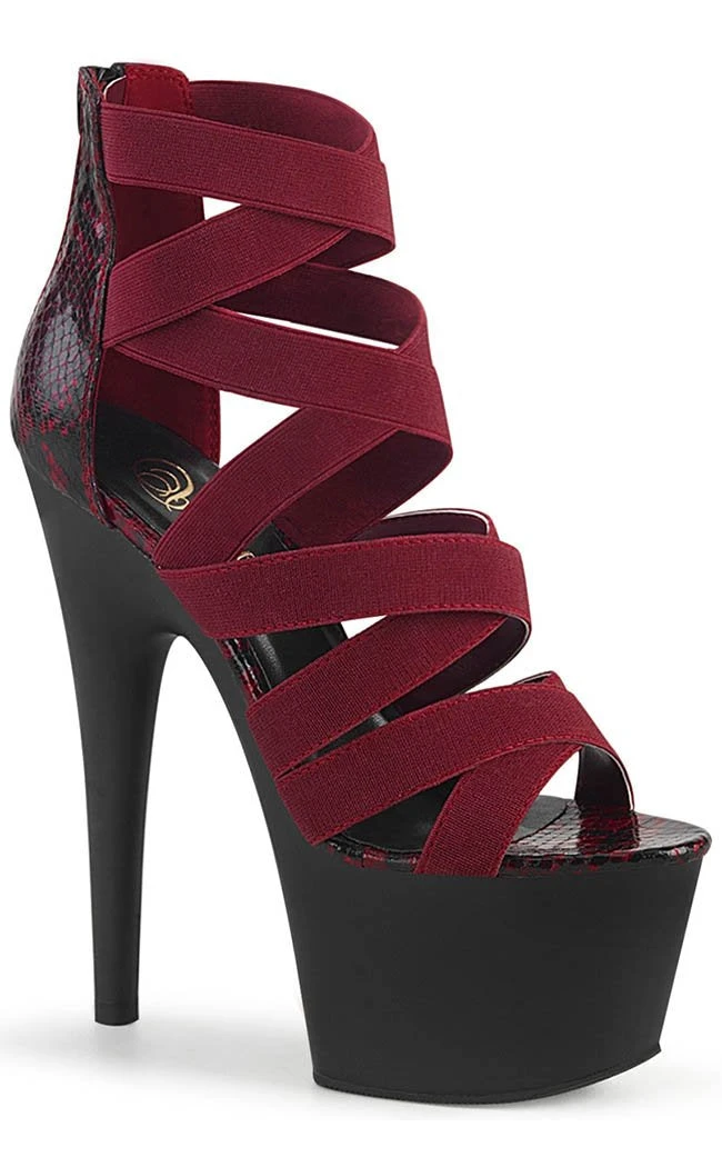 7″” (178mm) heel, 2 3/4″” (70mm) snake print platform with criss-crossing elastic straps.  Rear zip closure