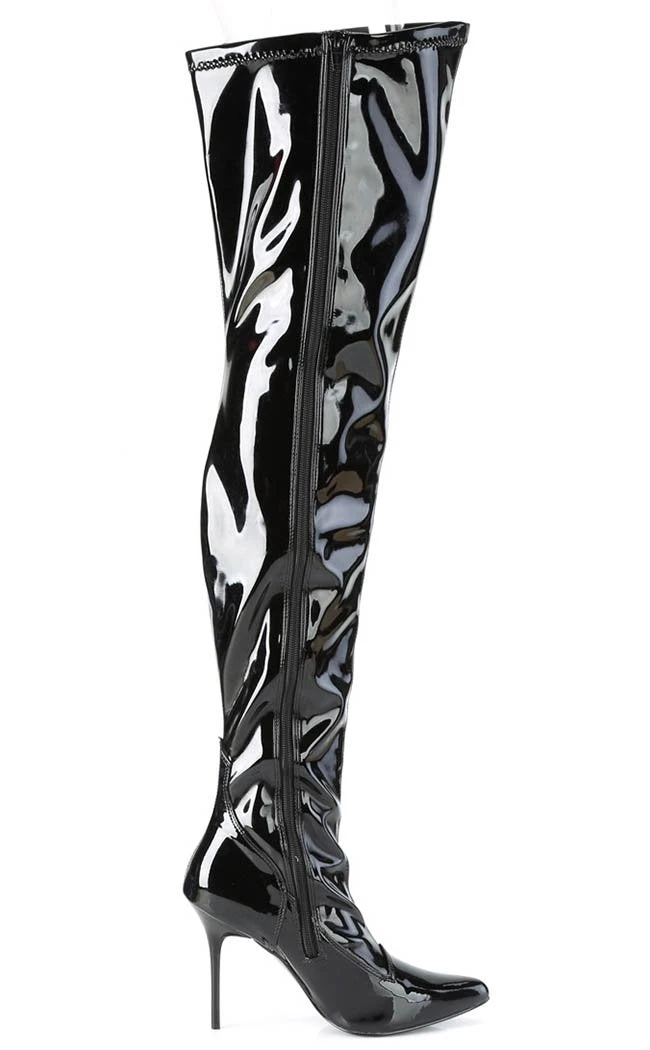 Classic heels for classy vixens! These sexy boots sit on a killer 4″ (102mm) heel and feature a sexy pointed toe and sleek black patent. These babies stretch and go over the knees to cling to your legs, securing easily with a side zip.