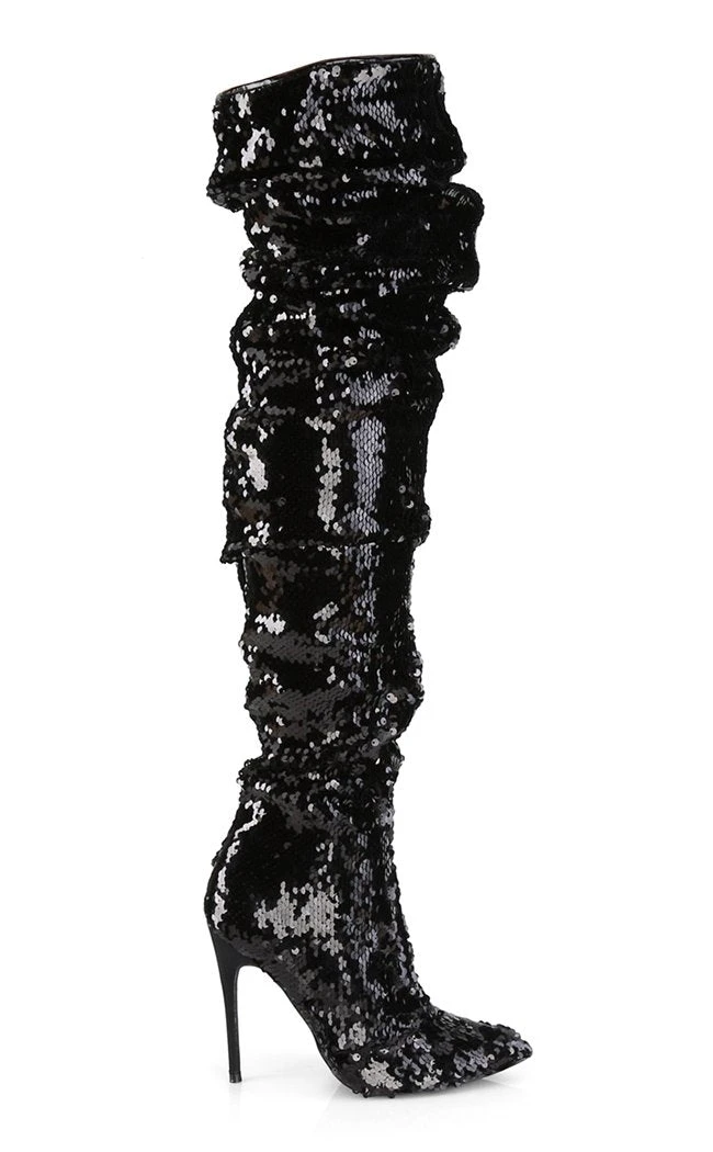 Glam black over-the-knee boot featuring ruched slouchy sequinned body, stiletto heel and single sole.