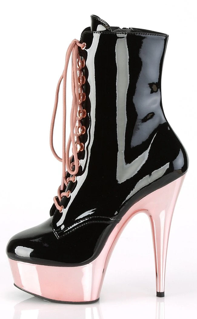 6″ (152mm) Heel, 1 3/4″ (45mm) Platform Lace-up Front Ankle Boot with Interchangeable Shoe Lace (Rose Gold & Black), Inside Zip Closure