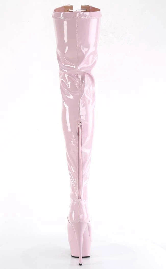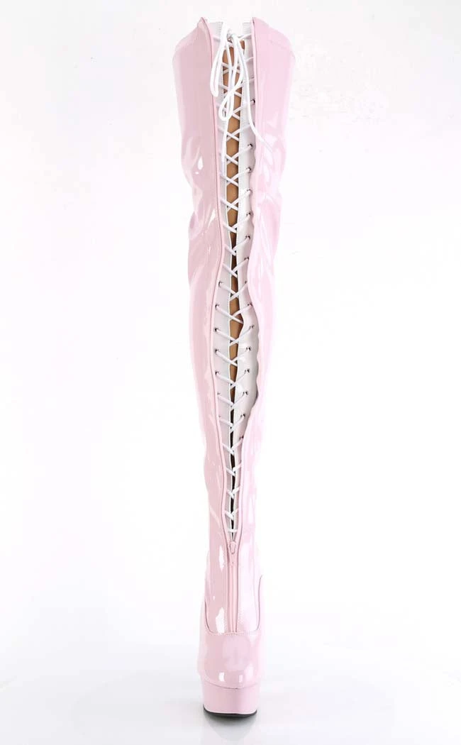 Light up the stage in the DELIGHT-3027 boots! These sexy thigh highs feature a two-toned patent upper and a front lace-up panel. A front and rear zip allow for easy on/off.