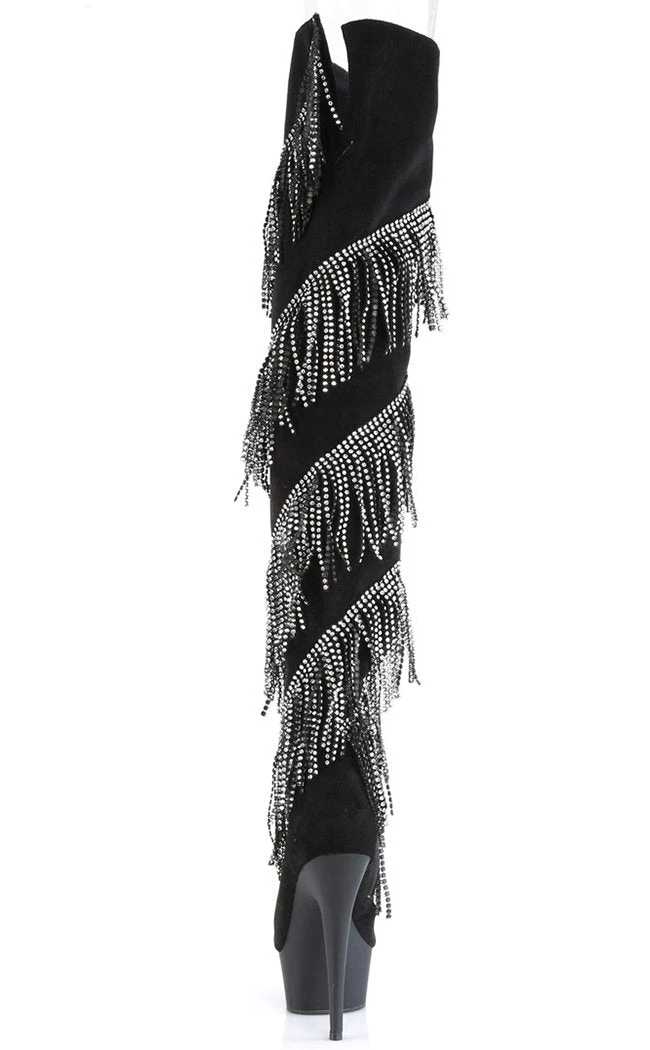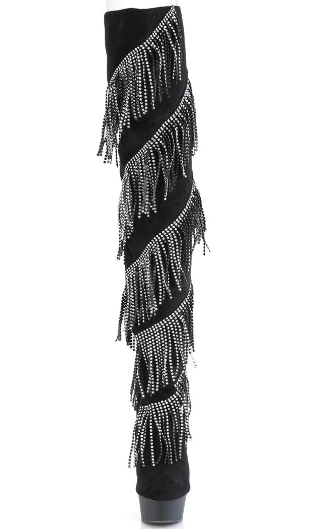 An XXXtra tall thigh-high boot in luxe black vegan suede, trimmed in a glamorous silver rhinestone fringe that spirals down the leg.