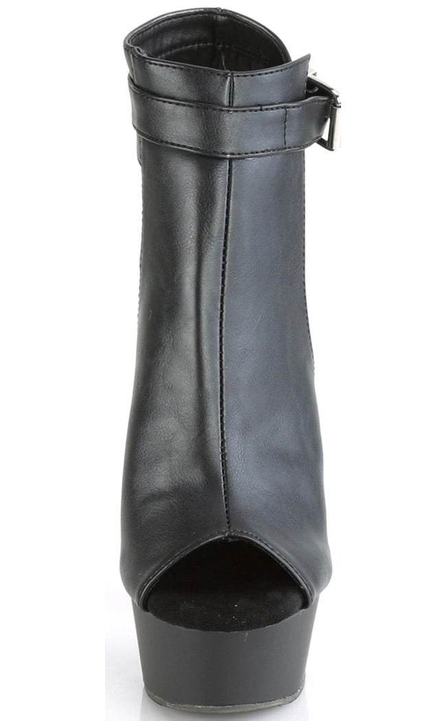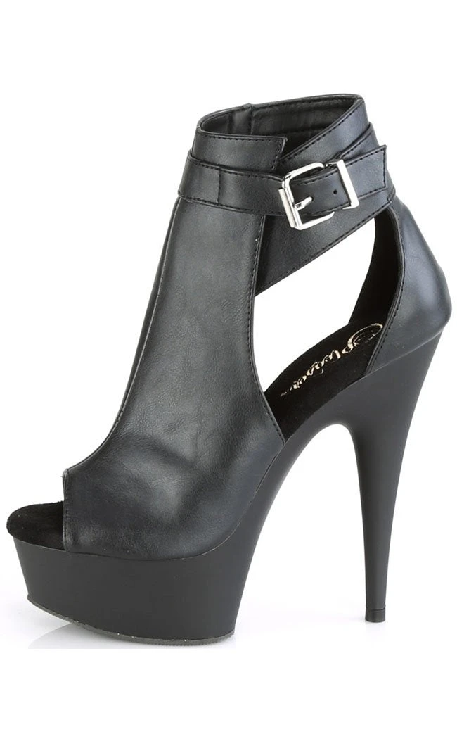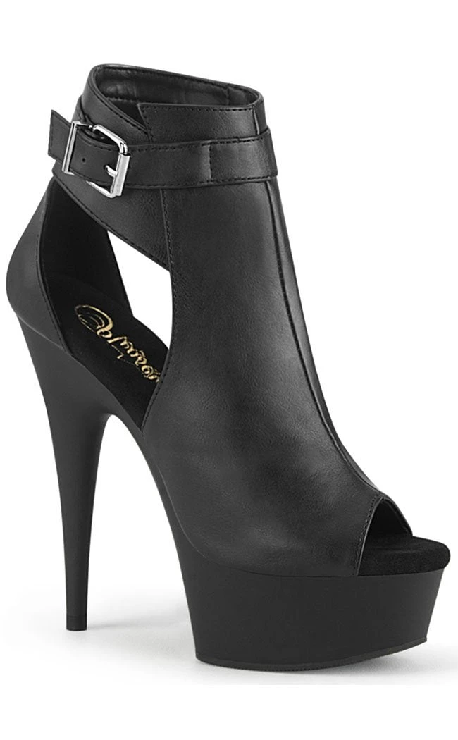 6″” (152mm) Heel, 1 3/4″” (45mm) platform peep toe heels. Ankle strap closure and cutout feature.