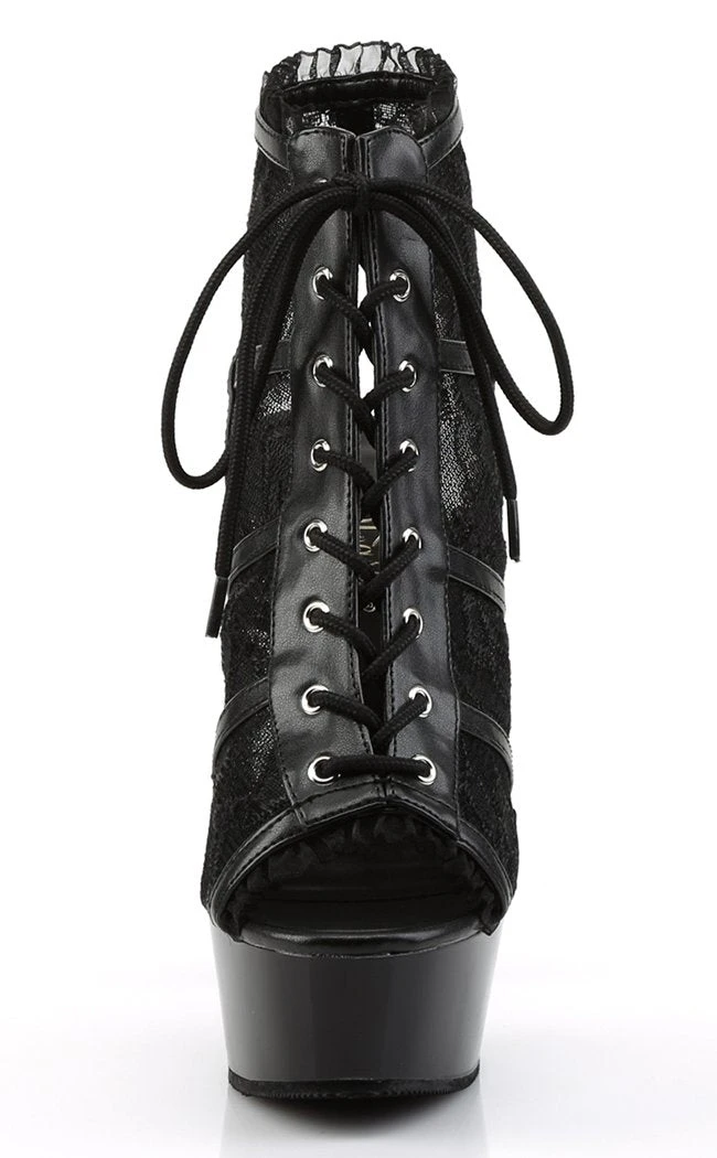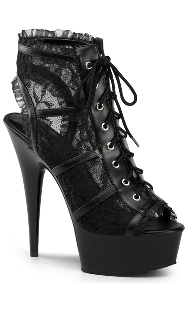 6″ Heel, 1 3/4″ PF Lace Up Open Toe Open Back Bootie