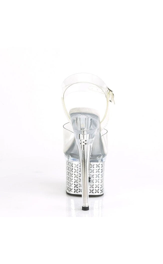 7″ (178MM) Heel, 3″ (76mm) Platform USB Chargeable LED Light-Up Ankle Strap Sandal w/Multi Color Disco Lighting Effects in Various Patterns/Settings, Featuring Chrome Plated Platform w/Flowers
