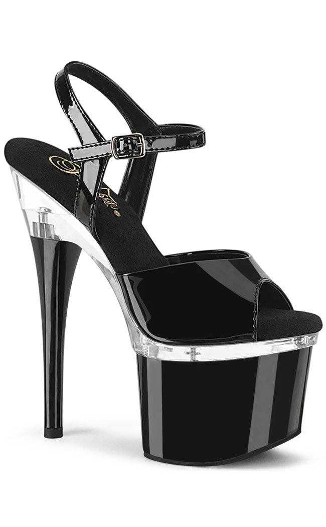 7″” (178mm) Heel, 3″” (76mm) peeptoe heels featiruing a shiny black platform with a red band and clear ankle strap.